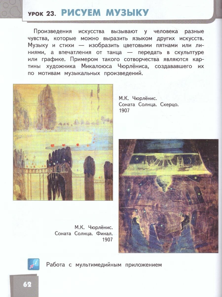 Учебник под редакцией доктора педагогических наук, профессора, члена-корреспондента РАО Л.Г. Савенковой реализует идею междисциплинарного проблемно-творческого обучения детей в соответствии с полихудожественным подходом к их эстетическому развитию, подразумевающим взаимодействие разных видов искусства и направлений художественной деятельности. Помимо теоретического освоения дисциплины, дети получают и развивают практические навыки работы с различными художественными материалами и инструментами. Издание призвано познакомить детей с многообразием видов, жанров и средств выразительности изобразительного искусства на примере лучших образцов отечественной и зарубежной художественной культуры. В 4 классе школьники знакомятся с русским народным искусством и архитектурой, с жанрами комикса и диафильма, изучают народные мотивы в творчестве профессиональных художников, расширяют свои познания об анималистическом жанре и натюрморте в изобразительном искусстве, об абстрактном искусстве, об анатомии и о дизайне, а также о передаче глубины пространства на плоскости. Среди уникальных разработок авторов, представленных в учебнике, выделяется компьютерный проект, позволяющий сочетать художественное развитие учащихся с практической деятельностью по освоению компьютерных технологий. В 4 классе детям предлагается самостоятельно создать небольшой диафильм с помощью программы PowerPoint. Материал учебника дополнен мультимедийным приложением, размещённым на сайте издательства и содержащее слайды для демонстрации, аудиофайлы и задания.