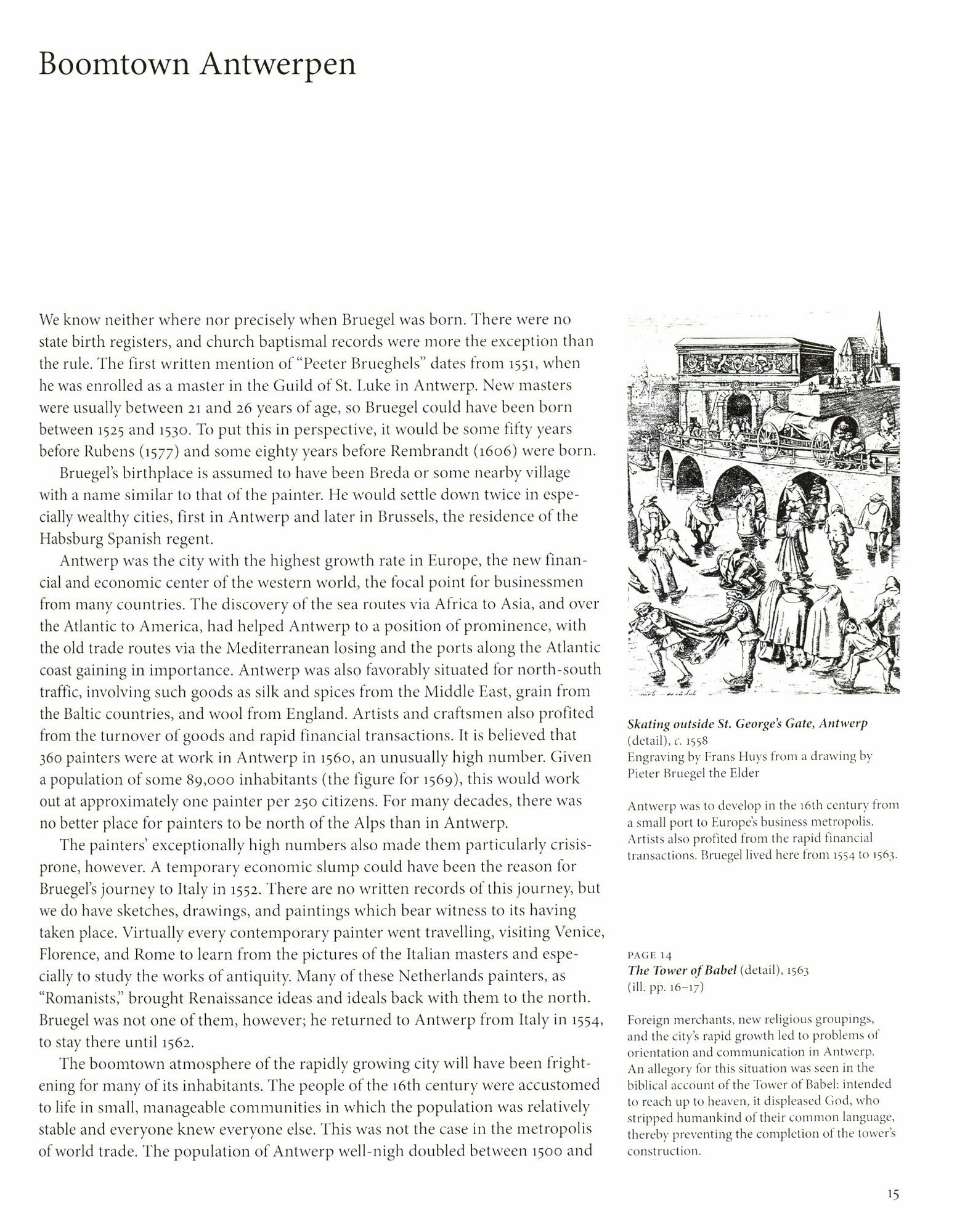 Immersing himself in rural or small-town communities, Bruegel is particularly notable for his depiction of peasant experience and folk culture, earning the artist nickname "Peasant Bruegel." Whether hunters shivering in the snow or a boisterous country fair, Bruegel raised the farming, festivals, gatherings, and games of peasant culture to the status of high art. Bruegel's imposing religious and moral subjects, meanwhile, such as The Triumph of Death and The Tower of Babel are as awestriking and influential today as they were in the 16th century, inspiring contemporary culture from The Lord of the Rings cinematic battle scenes to Don DeLillo's novel Underworld.