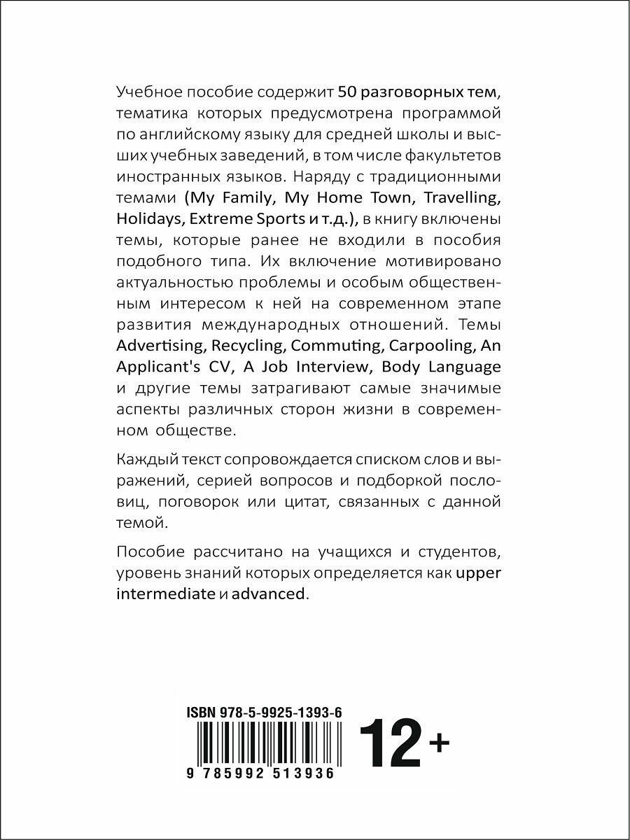 Учебное пособие содержит 50 разговорных тем, тематика которых предусмотрена программой по английскому языку для средней школы и высших учебных заведений, в том числе факультетов иностранных языков.