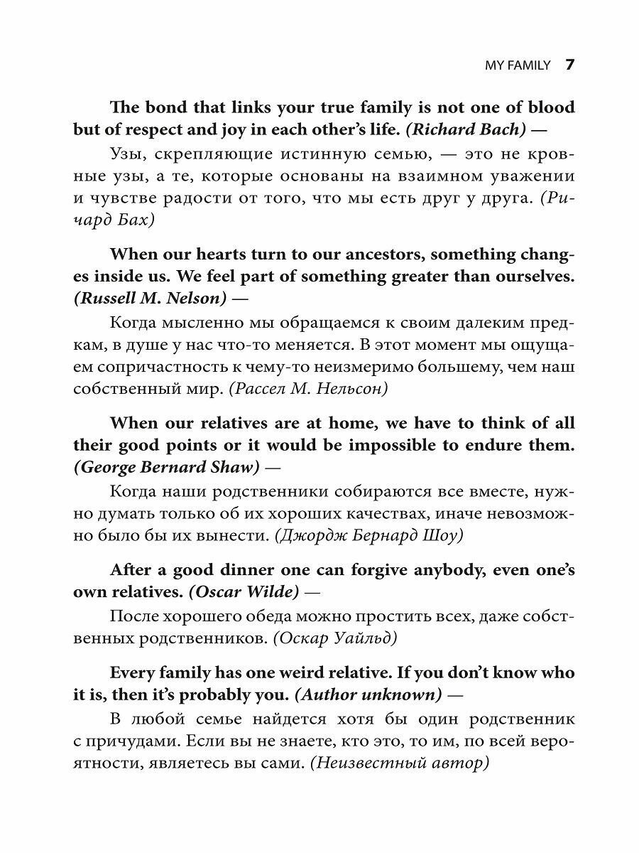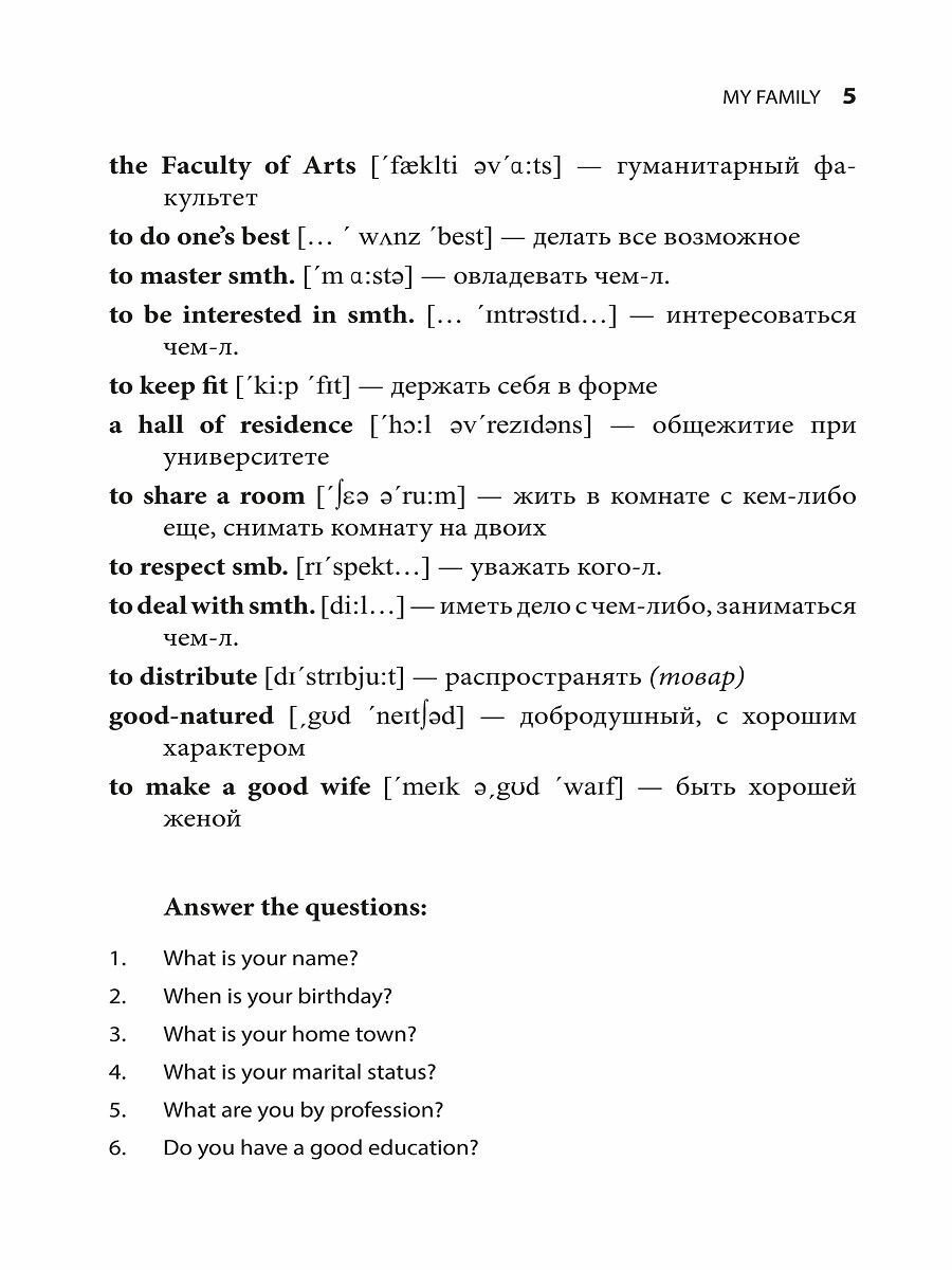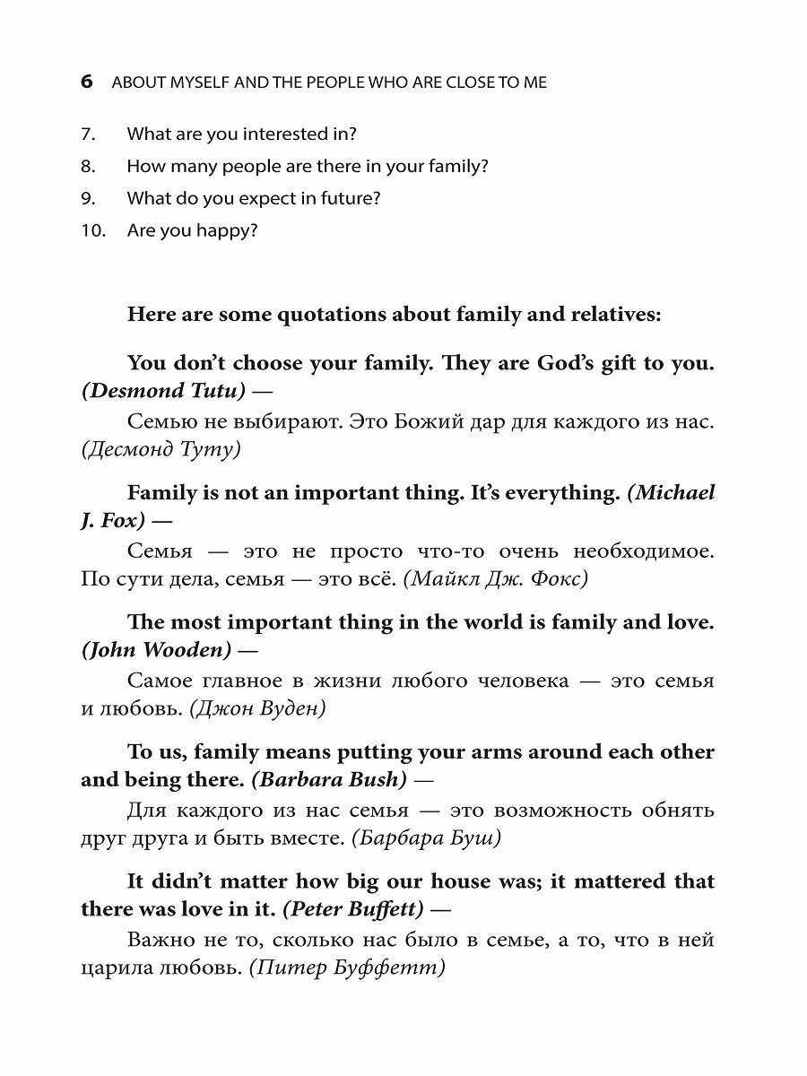 Каждый текст сопровождается списком слов и выражений, серией вопросов и подборкой пословиц, поговорок или цитат, связанных с данной темой. В ряде случаев, при избыточности последних, в задание включается другой вид работы, нацеленный на усвоение наиболее употребительных словосочетаний в разговоре на конкретную тему.