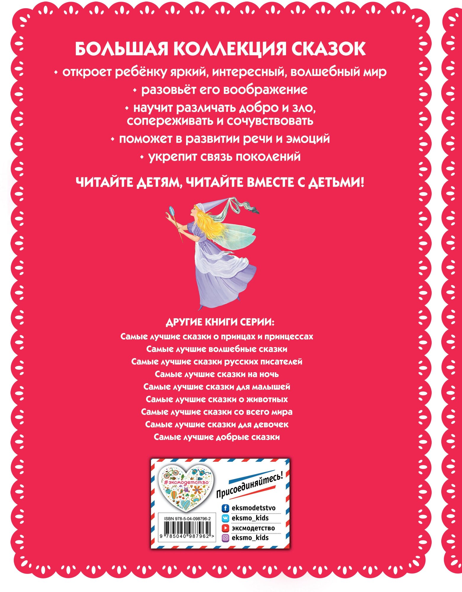 В яркую, богато иллюстрированную серию «Большая коллекция сказок» вошли самые лучшие сказки мира, от народных до литературных. Сказки — это неизменные спутники детства, подготавливающие ребёнка к встрече с большим миром. Они развивают воображение, учат и развлекают, воспитывают и заставляют задуматься. В серии вы найдёте самые лучшие сказки разных направлений: для самых маленьких читателей, сказки о животных, сказки русских писателей, волшебные сказки и многие-многие другие.