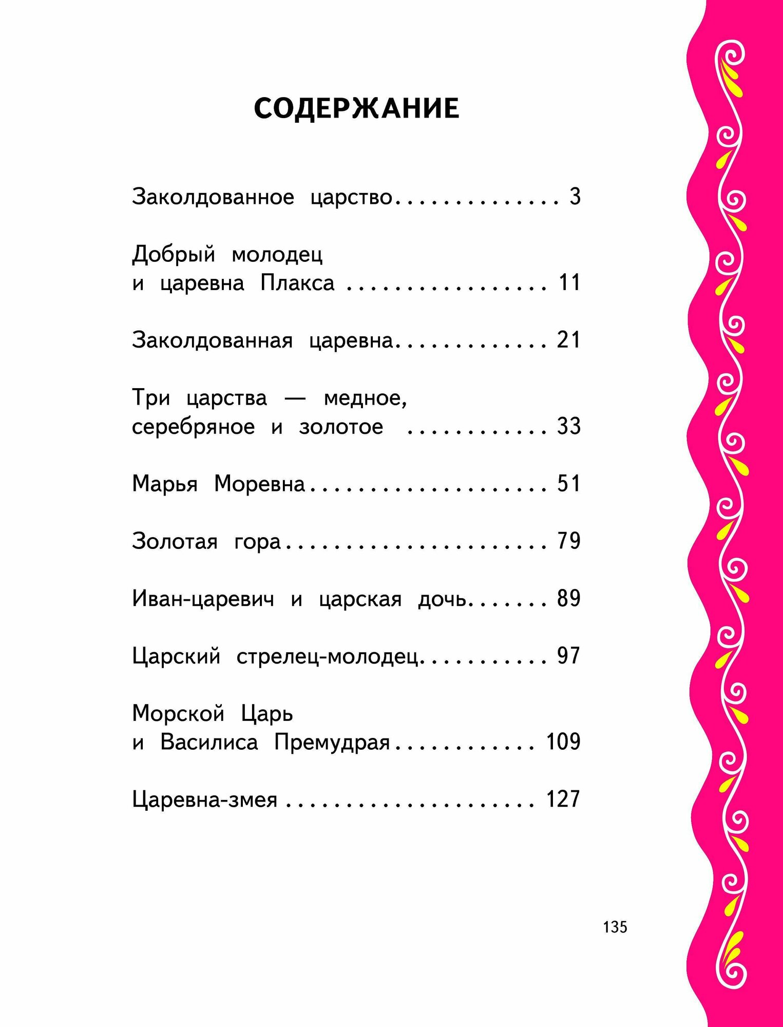В сборник вошли сказки "Заколдованное царство", "Добрый молодец и царевна Плакса", "Марья Моревна", "Золотая гора", "Иван-царевич и царская дочь", "Морской царь и Василиса Премудрая" и др.
