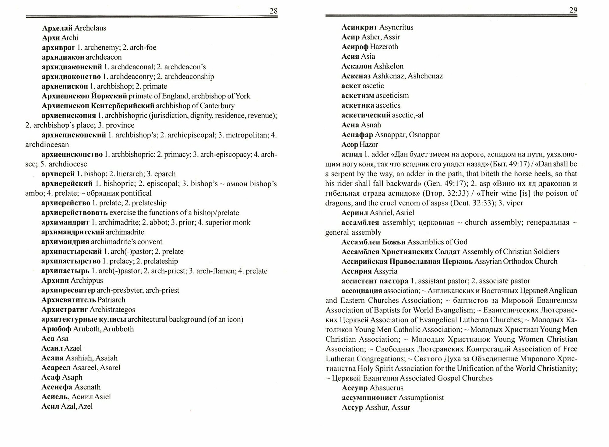 Русско-английский теологический словарь такого объема издается впервые. Его появление вызвано растущим интересом к переводу литературы религиозного и богословского содержания, а также дидактическими задачами преподавания английского языка в лингвистических учебных заведениях светской и духовного направленности. Словарь содержит около 30 000 лексических единиц и словоупотреблений, проиллюстрированных многочисленными примерами из Священных Писаний. Приводятся подробные соответствия слов, объясняются их значения и употребления, основной акцент приходится на использование лексики в ее богословской коннотации. Словарь позволяет выполнять перевод теологической литературы по общепринятым богословским концепциям любого уровня сложности.