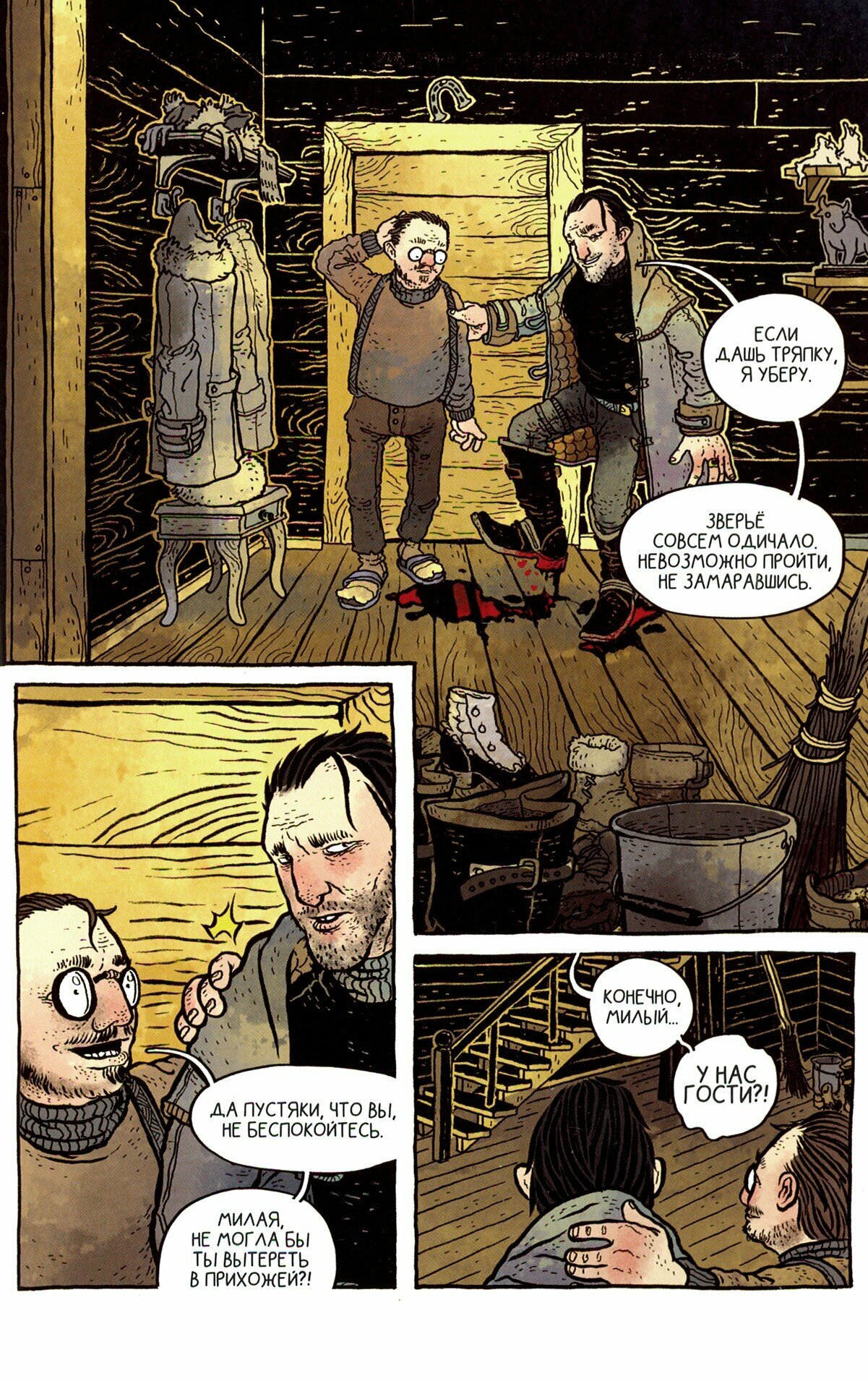 Само слово "Гоетия" в название привлекает внимание, ведь гоетия - средневековая магическая традиция вызывания демонов и составления талисманов. Сюжет книги похож на мистические триллеры-ужастики 90-х: спасающийся бегством псих находит в лесу одинокий дом, в котором живёт пасторальная на вид пара, однако со странным бросающимся в глаза поведением. Думая, что эмоционально и физически сильнее, гость предпринимает попытку доминировать. Но тут-то и нашла коса на камень, ведь хозяева не те, кем кажутся! Открытие грязных тайн о прошлом персонажей, экшен, кровь, переворот сознания и концовка в которой всё не будет хорошо для положительного персонажа (ведь положительных здесь нет). Возможно чем-то напомнило "Служба доставки Мезмо". Рисунок Димы Осипенко уникален, а его комиксов, к сожалению, не так уж и много - поэтому стоит взять для коллекции (я купил, увидев имя художника на обложке). К тому же книга полностью в цвете.