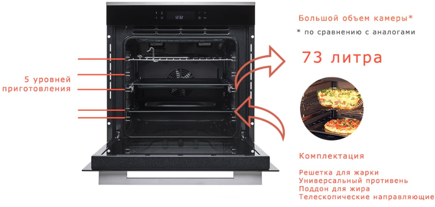 | Духовка | электрическая, 67 л, эмаль легкой очистки, 3390 Вт |