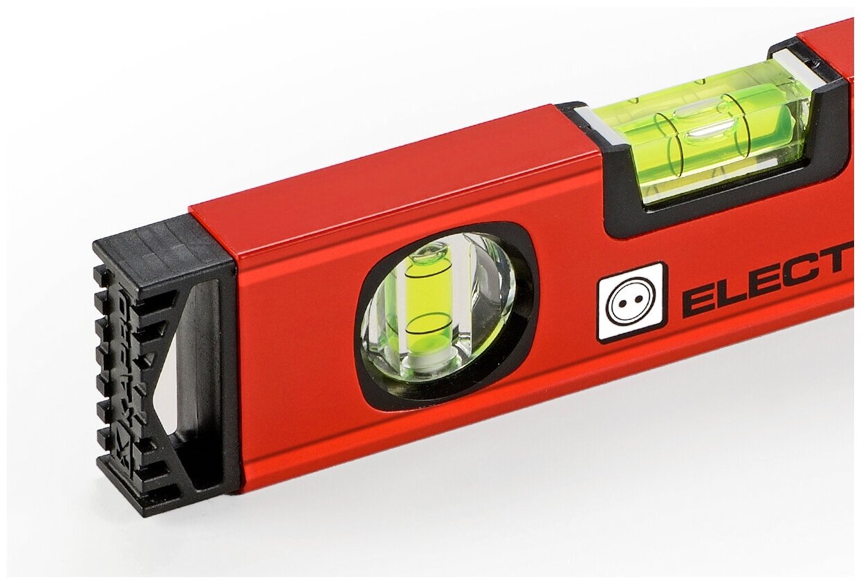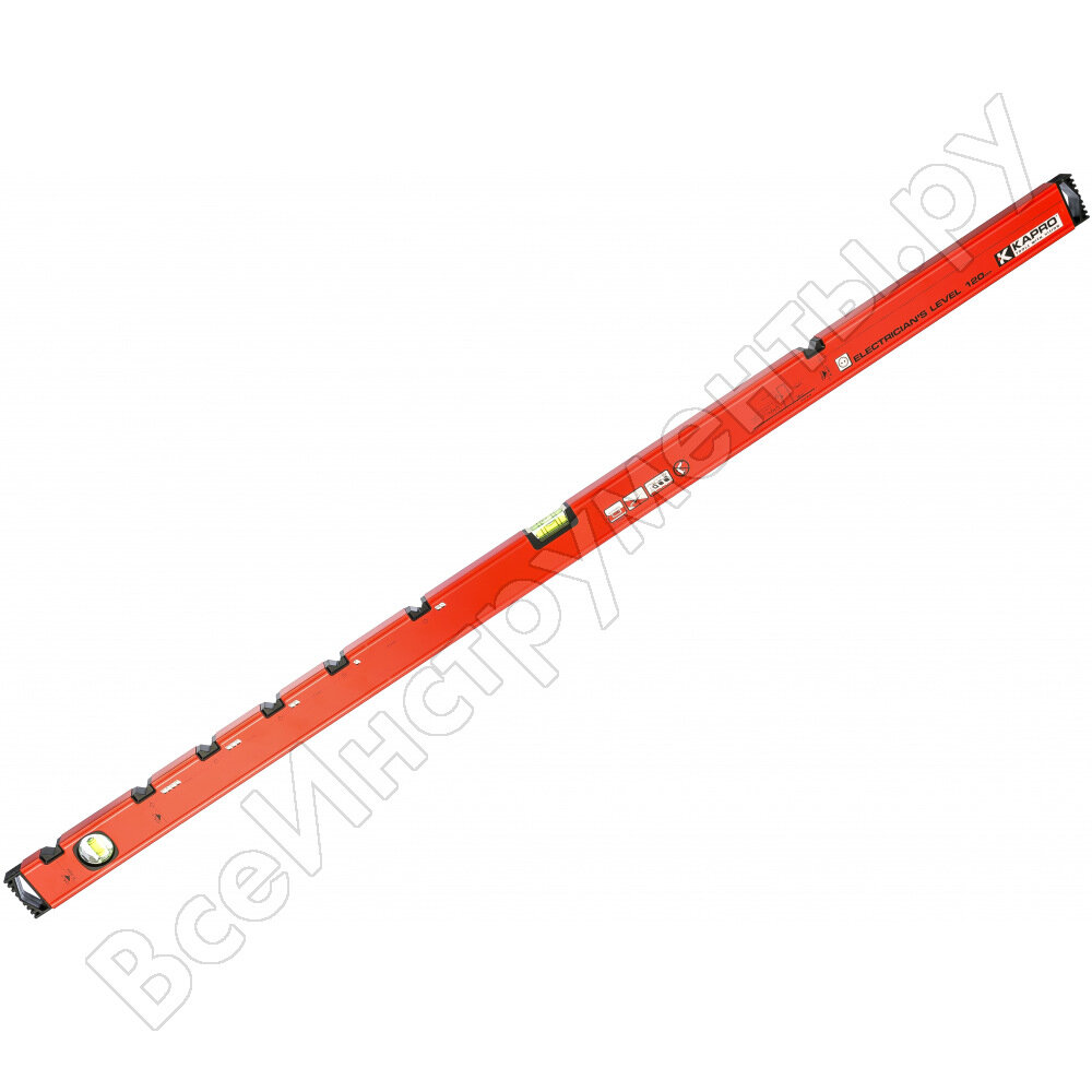 Профессиональный пузырьковый уровень для электромонтажа Kapro. Оснащен специальными отметками под монтаж розеток, а также вырезами с интервалами для быстрой разметки нужного количества подрозетников. Две пузырьковые капсулы, прочный алюминиевый корпус, амортизирующие торцевые заглушки, корпусные противоскользящие вставки. Погрешность в пределах 0,5 мм/м.