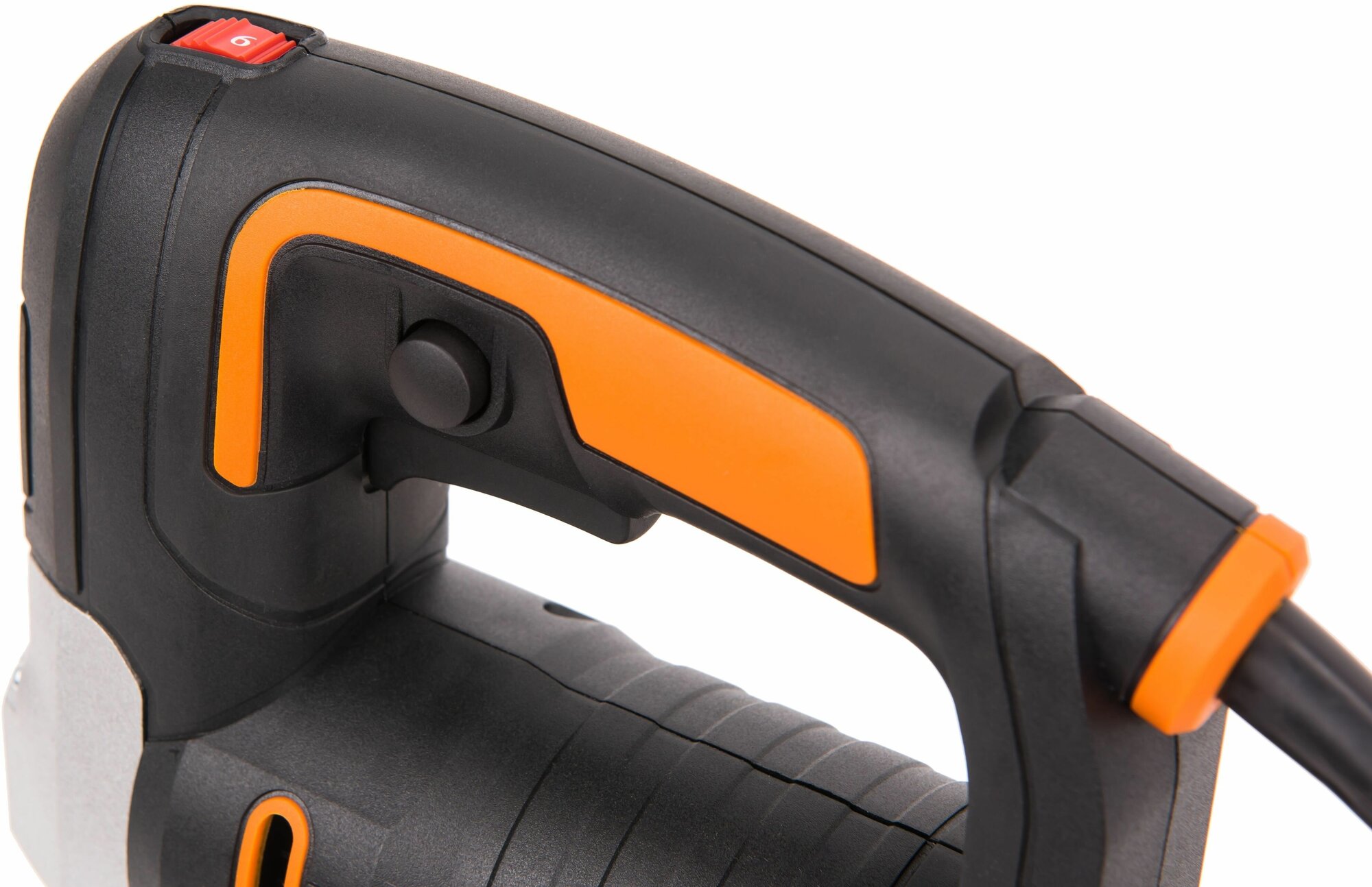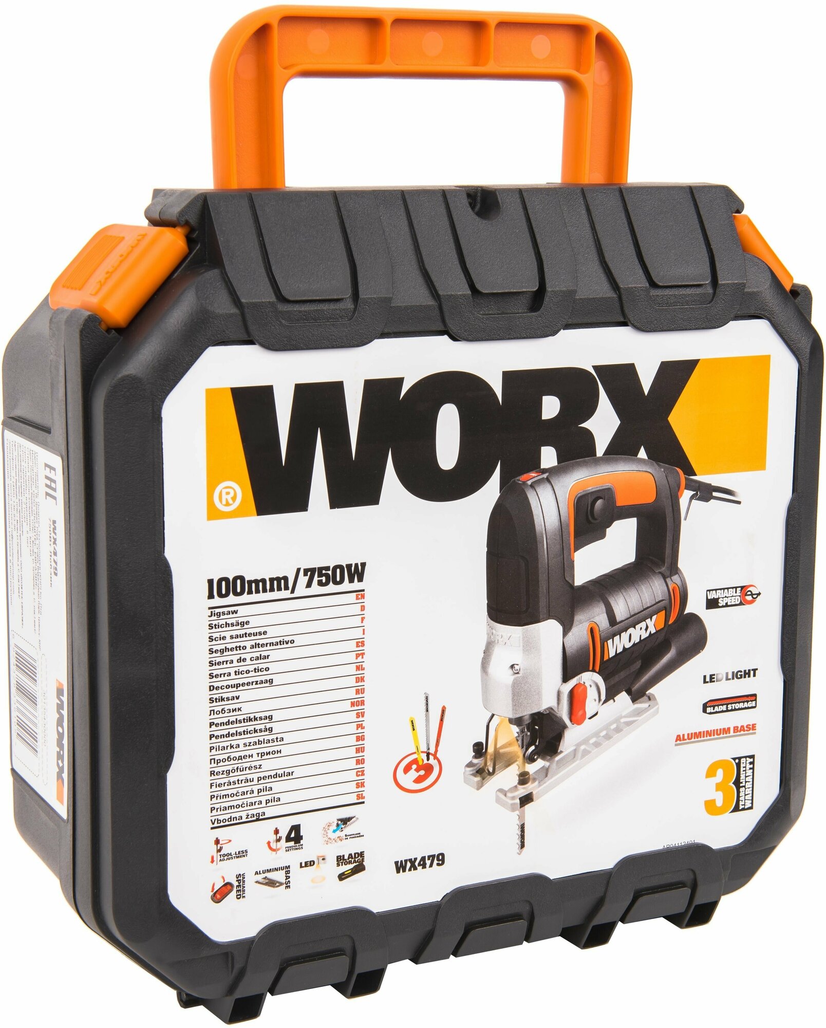 Лобзик WORX WX479 с подсветкой работает от сети 230 В и имеет мощность 750 Вт. Обладает безинструментальной сменой пилки и 4 ступенями маятникового хода для повышения эффективности пиления, регулируемой базой для резки под углом, 0-45 градусов способностью скоса пиления. Для очистки места среза имеется пылесборник. Данная модель поставляется в кейсе.