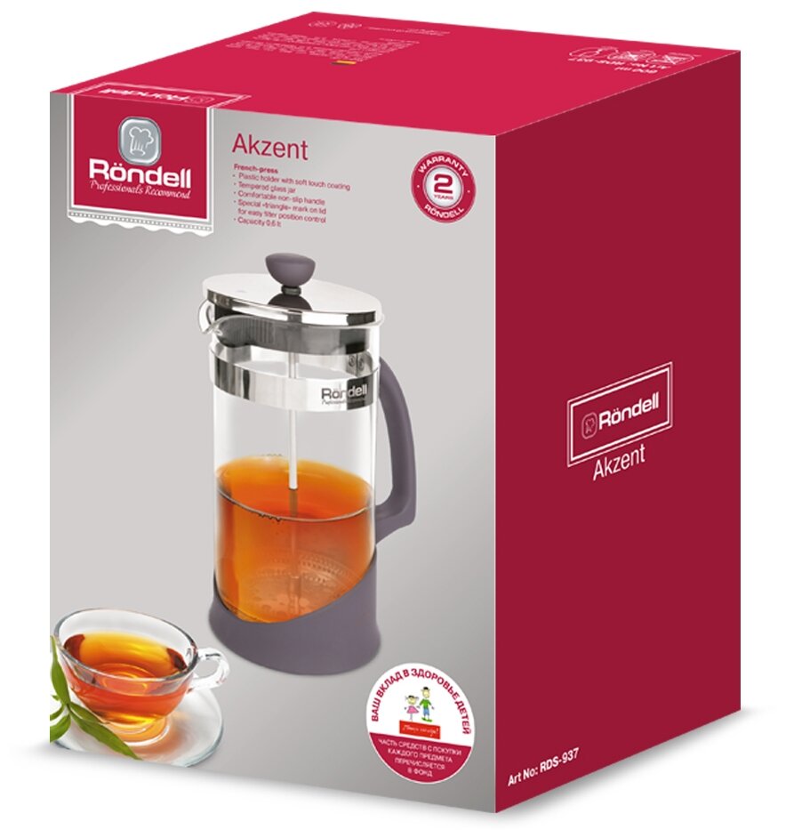 Френч-прессы Akzent от Röndell ломают все привычные представления, поражая потенциальных владельцев гармоничным дизайном и удивляя приятной стоимостью. Колба устройства изготовлена из высококачественного термостойкого стекла и дополнена деталями из бакелита изумительного черничного цвета с покрытием Soft Touch и превосходной нержавеющей стали. Для особого комфорта в использовании на крышке френч-пресса имеется специальный значок-треугольник, который «подскажет», где расположен фильтр слива.
