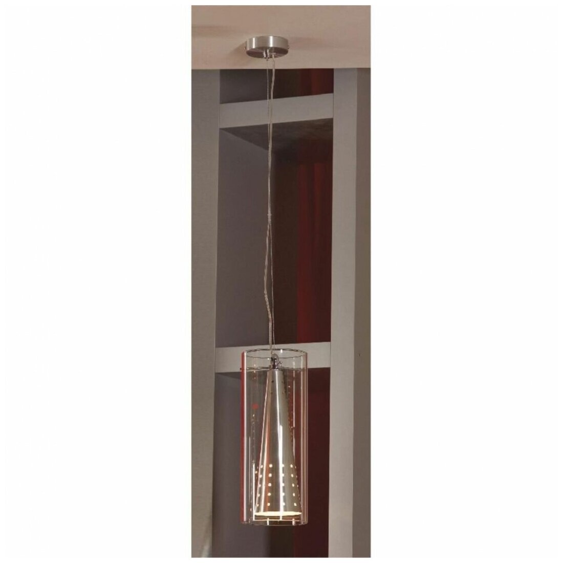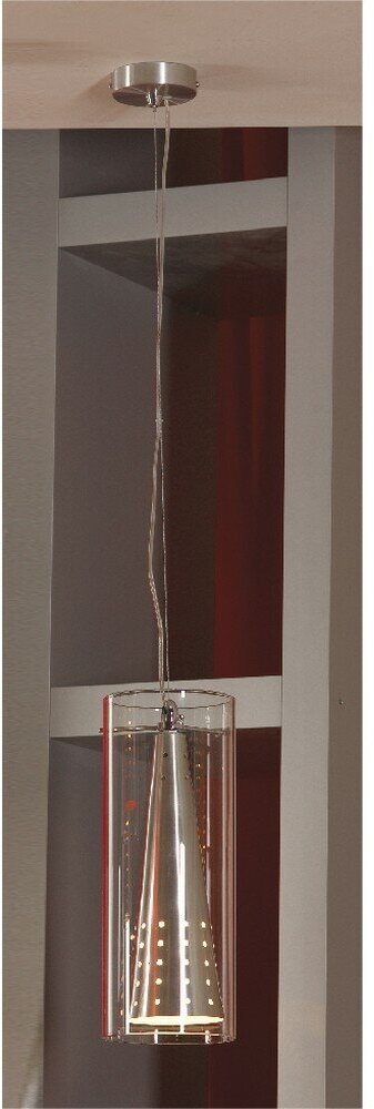 Подвесной светильник Lussole Vasto – необычная модель, выполненная в форме цилиндра, в котором помещен конусовидный элемент с маленькими круглыми отверстиями. Модель смотрится необычно за счет такого оформления, а за счет серебристого оттенка богато.