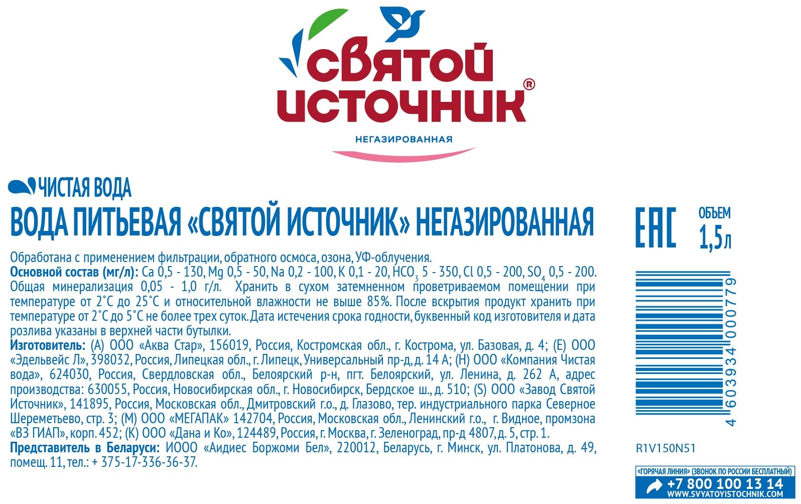 Вода питьевая Святой Источник негазированная ПЭТ без вкуса 1.5 л