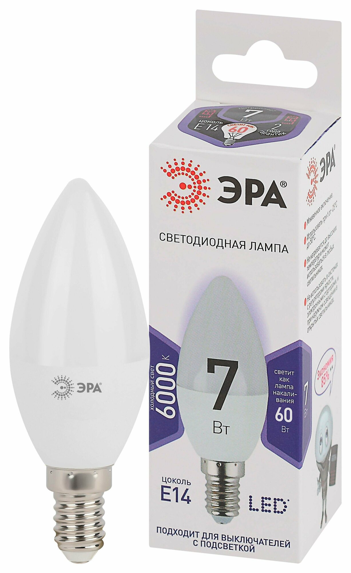 Светодиодная лампа ЭРА с цоколем E14 и колбой в форме свечи при мощности всего 7 Вт по яркости эквивалентна лампе накаливания 60 Вт, экономит почти 90% электроэнергии и заметно сокращает расходы.