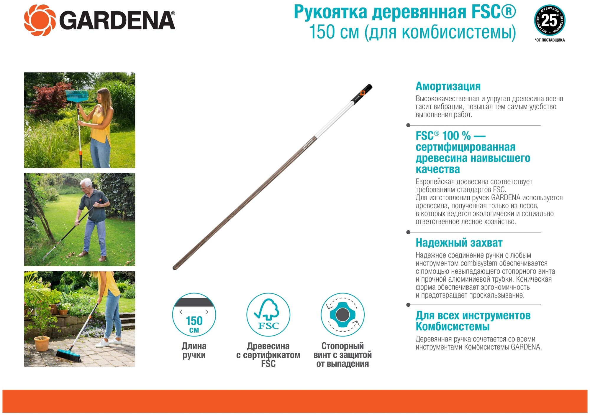 Ручка деревянная для Комбисистемы GARDENA, выполненная по технологии FSC® 100 %, позволяет удлинить любой инструмент Комбисистемы. Высококачественная упругая древесина ясеня из Европы хорошо гасит вибрацию и соответствует требованиям стандартов FSC, а это гарантирует, что для производства ручек используется только древесина, выращенная в лесах, в которых ведется экологичное и социально ответственное лесное хозяйство. Ручка зауженной формы длиной 150 см удобно лежит в руке и предотвращает проскальзывание. Трубка из анодированного алюминия снабжена на конце покрытием из пластика и гарантирует надежное и безопасное соединение ручки с инструментом для Комбисистемы. Стопорный винт с головкой из мягкого пластика для надежного крепления ручки к инструменту для Комбисистемы снабжен защитой от выпадения. Гарантия 25 лет. Рекомендация: для работ, связанных с выдергиванием и толканием, рекомендуется использовать более длинные ручки, а для работ, связанных с рыхлением, рекомендуется использовать более короткие ручки.