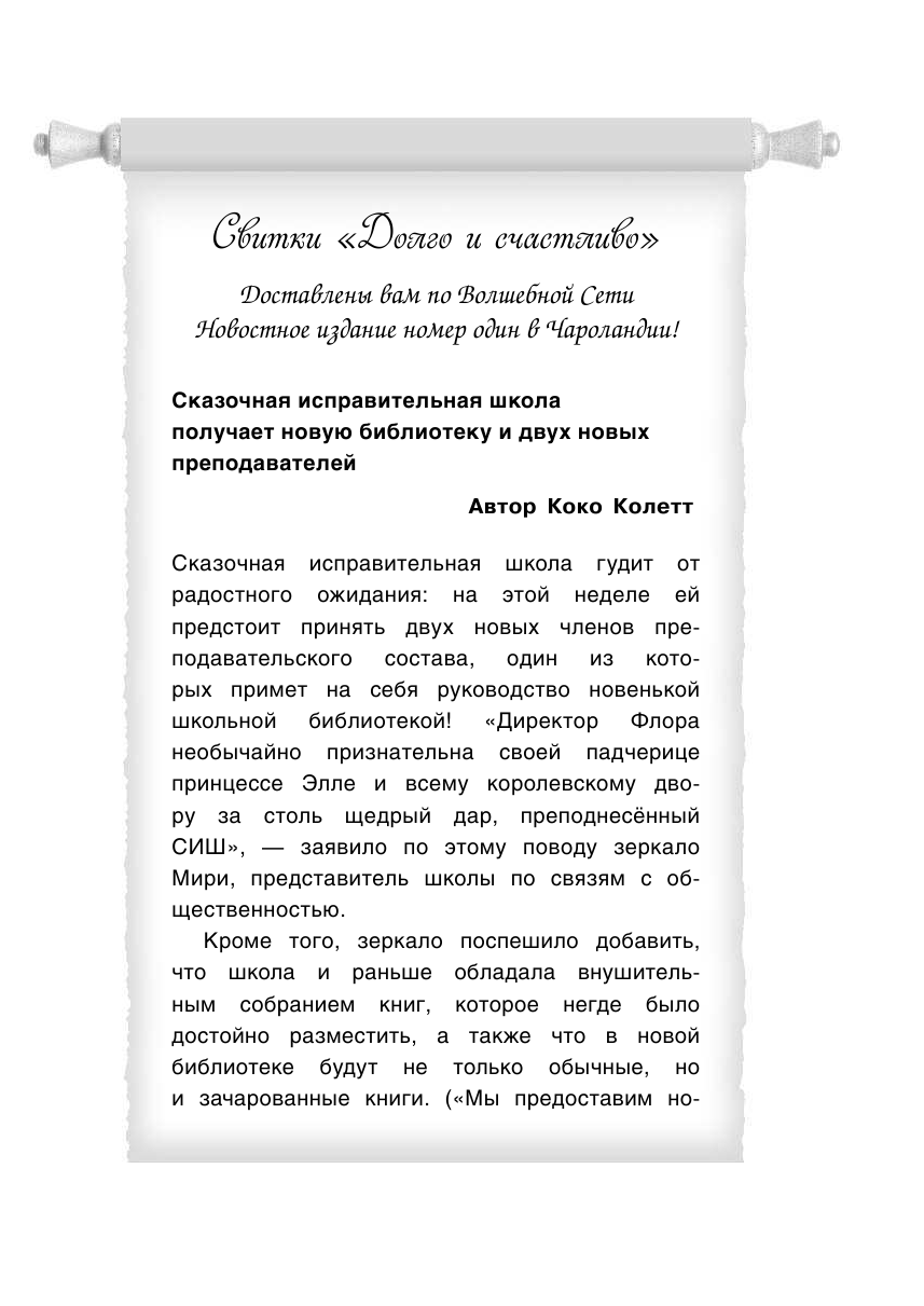 Из всех книг, что я покупала для младшей сестры или племянников, серия "СИШ" увлекла и меня саму. Написано простым и в тоже время интересным подростку языком, с нотками иронии, преподаватели - персонажи из известнейших сказок детства переработаны и, кажется, выросли, как и мы. Главная героиня Джилли подросток с такими же проблемами, как у современных подростков, от ее лица и ведется повествование. Зацепило местное СМИ "Свитки "Долго и счастливо", в котором в этой книге вышли интервью с принцем Себастьяном и Белль, оказывается, у них есть дочь (не буду спойлерить, прочитайте сами). Надеюсь, в будущем выйдет еще ни одна книга об этой вселенной.
