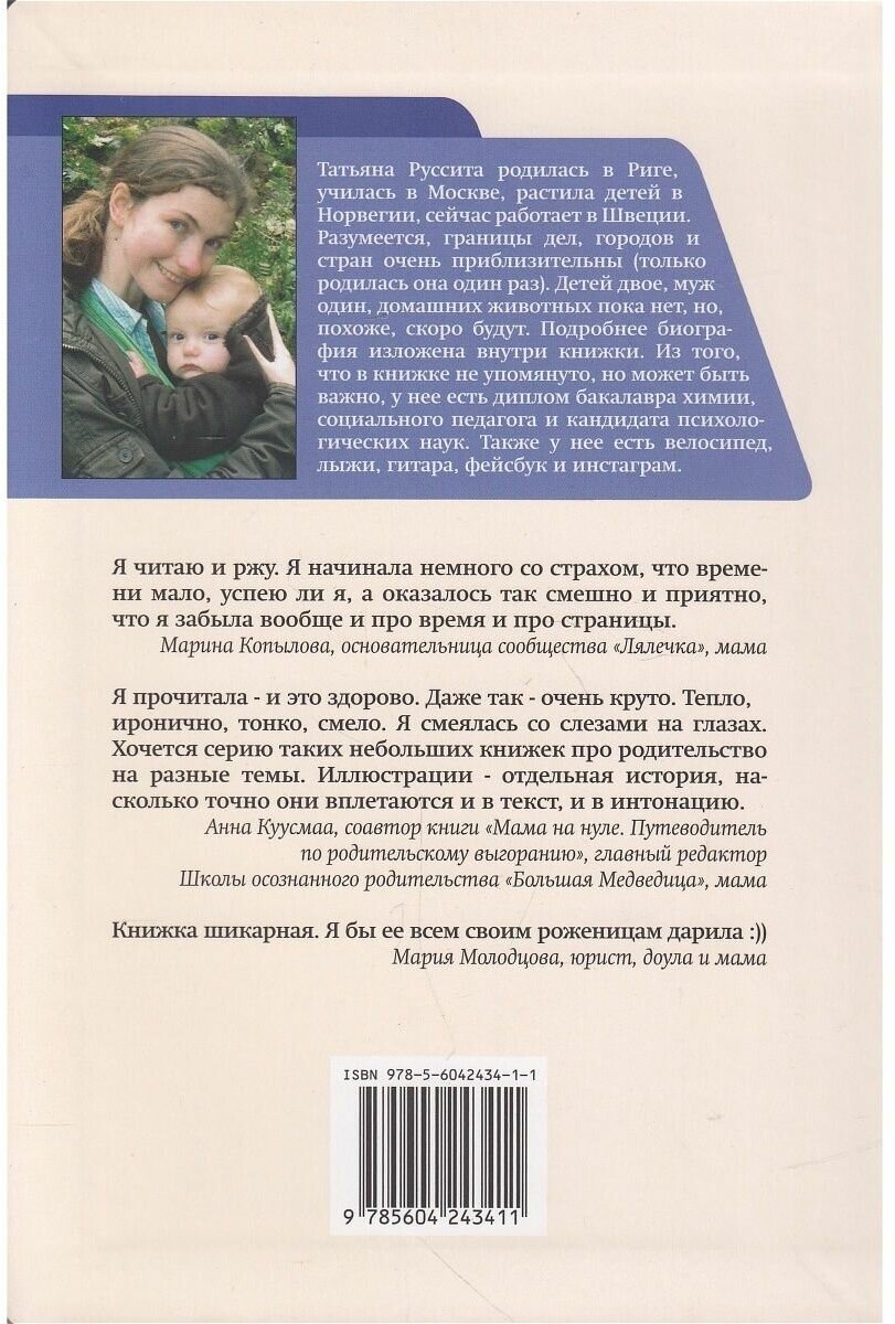 Эх, немного досадно, что книжка Тани Русситы мне попалась не 6 лет назад, когда родился старший сын, а только сейчас. Моя история с грудным кормлением могла бы быть длиннее и интереснее. Готовясь стать мамой, я читала про детей, которые не плюются едой и не капризничают (до сих пор не понимаю, как такое бывает), а лучше бы почитала про опыт с грудным кормлением, где в самом начале не все так просто. Разбитый сосок будет покруче убийства в первой главе. Но потом наступает состояние единения с собой, грудью, малышами и пусть весь мир подождёт.