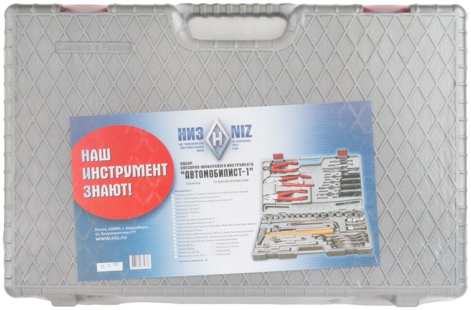 Набор «Автомобилист-1» включает в себя 42 изделия, которые изготовлены из легированной стали и способны выдерживать высокие нагрузки при эксплуатации. Пластиковый кейс, в который они укомплектованы, убережёт от повреждений и потери.«Автомобилист-1» станет для вас не только незаменимым при ремонте и обслуживании автомобилей, но и подойдёт для более серьёзных слесарно-монтажных манипуляций.Комплектацияголовки сменные 1/2″: 8, 10, 11, 12, 13, 14, 15, 17, 19, 21, 22, 24, 27, 30, 32 мм;ключ присоединительный квадратом 1/2″;ключ присоединительный квадратом изогнутый 1/2″;ключ трещоточный 1/2″;удлинитель 1/2″, 125 мм;удлинитель 1/2″, 250 мм;шарнир 1/2″;головка торцевая свечная 1/2″: 16, 21 мм;ключи рожковые: 8 х 10, 10 х 12, 13 х 15, 14 х 17, 17 х 19, 19 х 22, 22 х 24;ключ разводной, 19 мм;плоскогубцы комбинированные, 200 мм;плоскогубцы регулируемые;кусачки боковые, 160 мм;кернер, 2 мм;бородок, 2 мм;зубило, 16 х 160 мм;молоток, 0,4 кг;отвёртки плоские: 0,6 х 4 мм, 1 х 6,5 мм;отвёртки крестовые: PH1, PH2;пластиковый кейс.ХарактеристикиТип: набор инструментов.Материал: инструментальная сталь, пластик.Защитно-декоративное покрытие инструмента: цинк, сплав никеля и хрома.Назначение: автомобильный.Упаковка: пластиковый кейс.Новосибирский инструментальный завод (НИЗ) действует на рынке уже 75 лет. На сегодняшний день он полностью отвечает потребностям рынка, предоставляя своему потребителю высококачественную продукцию по приятным ценам.