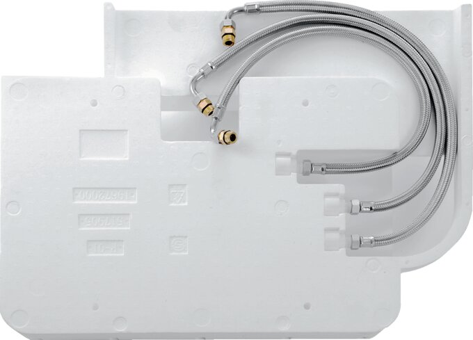 Скрытая часть для монтажа большого потолочного душа Hansgrohe Raindance Rainmaker (арт. 28417000 и 28418000). Рекомендуется устанавливать заранее, еще на ранней стадии ремонта, чтобы затем спокойно подбирать внешнюю часть. Скрытая часть представляет собой корпус из пенополистирола и "душевые диски" шаблон для точной установки Rainmaker и фиксации трех подключенных шлангов. В комплект поставки входит заглушка, которая позволяет сразу же проверить продукт на герметичность. Все крепежные винты для скрытой и наружной частей так же поставляются в одной упаковке. Деко-модель из пенопропилена перед установкой нужно сломать и утилизировать.