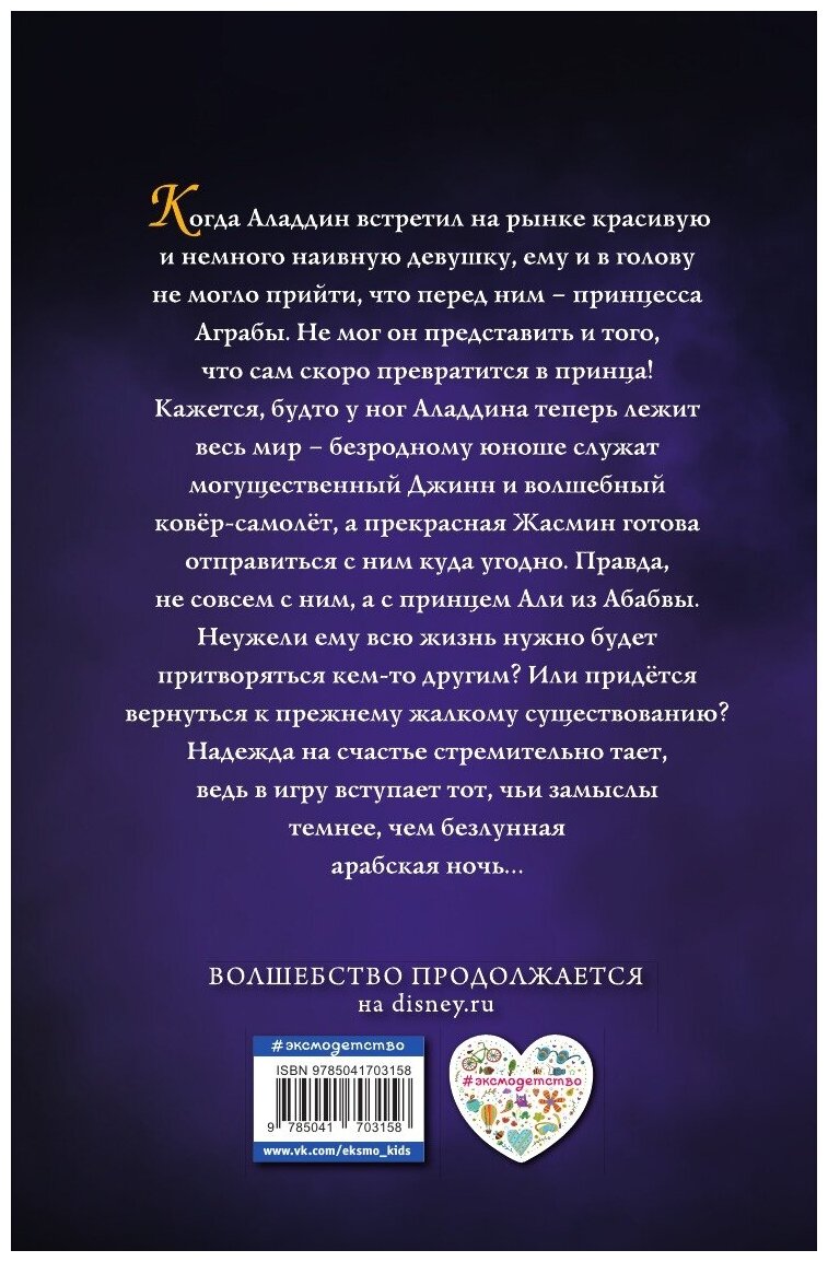 Аладдин, с детства живущий на улицах Аграбы, день за днём только и слышит: "Бродяга! Оборванец!" Но на самом деле у парня золотое сердце, и он мечтает о большем. Как же этого добиться, когда за душой у тебя - ни гроша?Жасмин - принцесса, мечтающая вырваться из дворца, чтобы узнать свой народ и стать для него лучшей правительницей. Однако родной дом давно стал для неё золотой клеткой из-за опеки любящего отца и происков его коварного советника.Когда два человека, столь разные и в то же время столь похожие, встречаются, у них появляется шанс воплотить свои мечты в реальность. Однако с новыми возможностями приходят и новые испытания.Добро пожаловать в сказку, полную чудес, волшебства и приключений!Издательство ЭКСМОМягкий переплетОбъем - 256 стр.Формат - 130x200 мм.ISBN 978-5-04-170315-8Год издания: 2022
