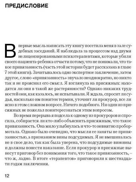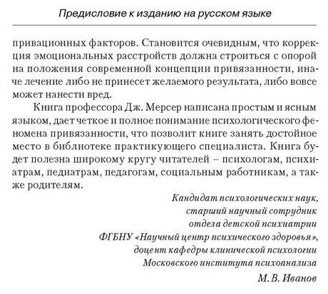 Профессор Джин Мерсер, признанный эксперт в области психического здоровья детей, описывает историю представлений о привязанности, дает определение привязанности и близким терминам, обсуждает проблемы ее измерения и этапы ее развития на протяжении всей жизни. Она объясняет, что такое хорошая и плохая привязанность, как возникают и к чему ведут нарушения привязанности и какими должны быть родительские установки в процессе ухода за младенцами и старшими детьми. Обсуждается формирование привязанности у ребенка, живущего в полной, неполной или приемной семье. Особое внимание уделено оценке эффективности и безопасности терапии нарушений привязанности.