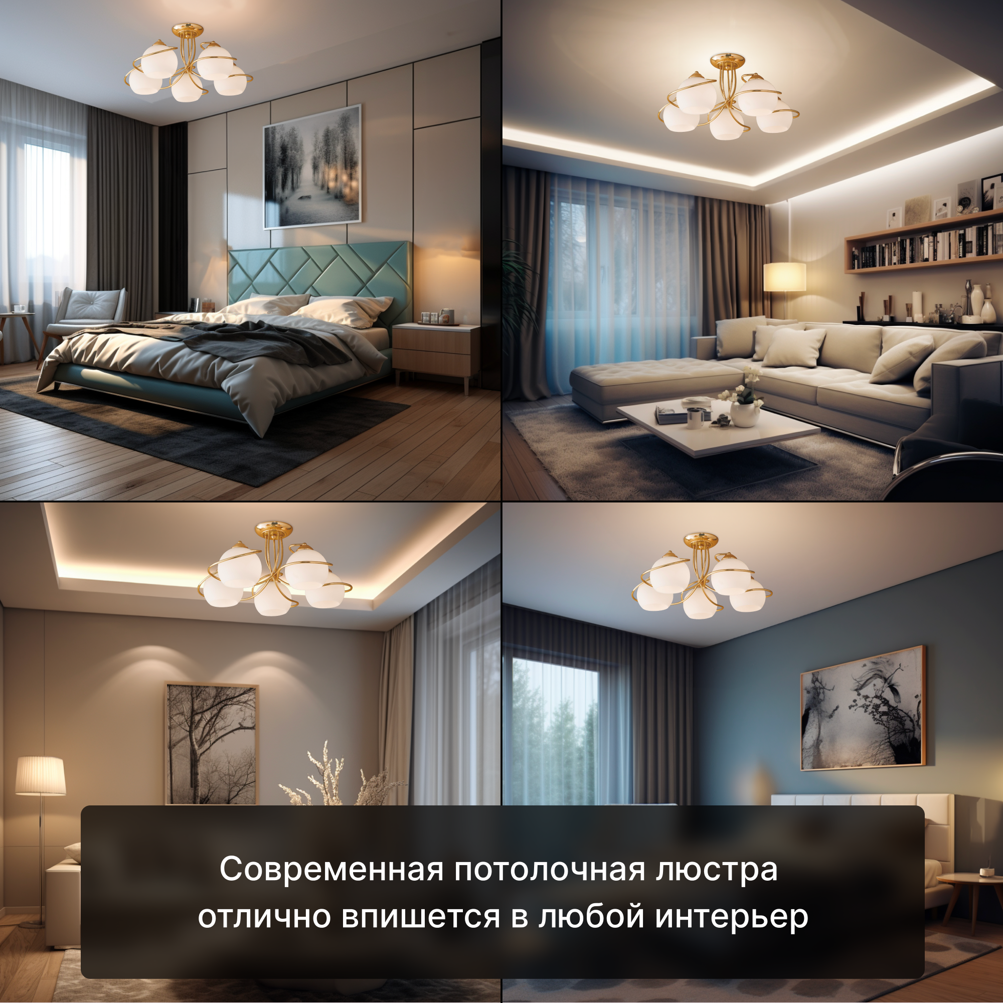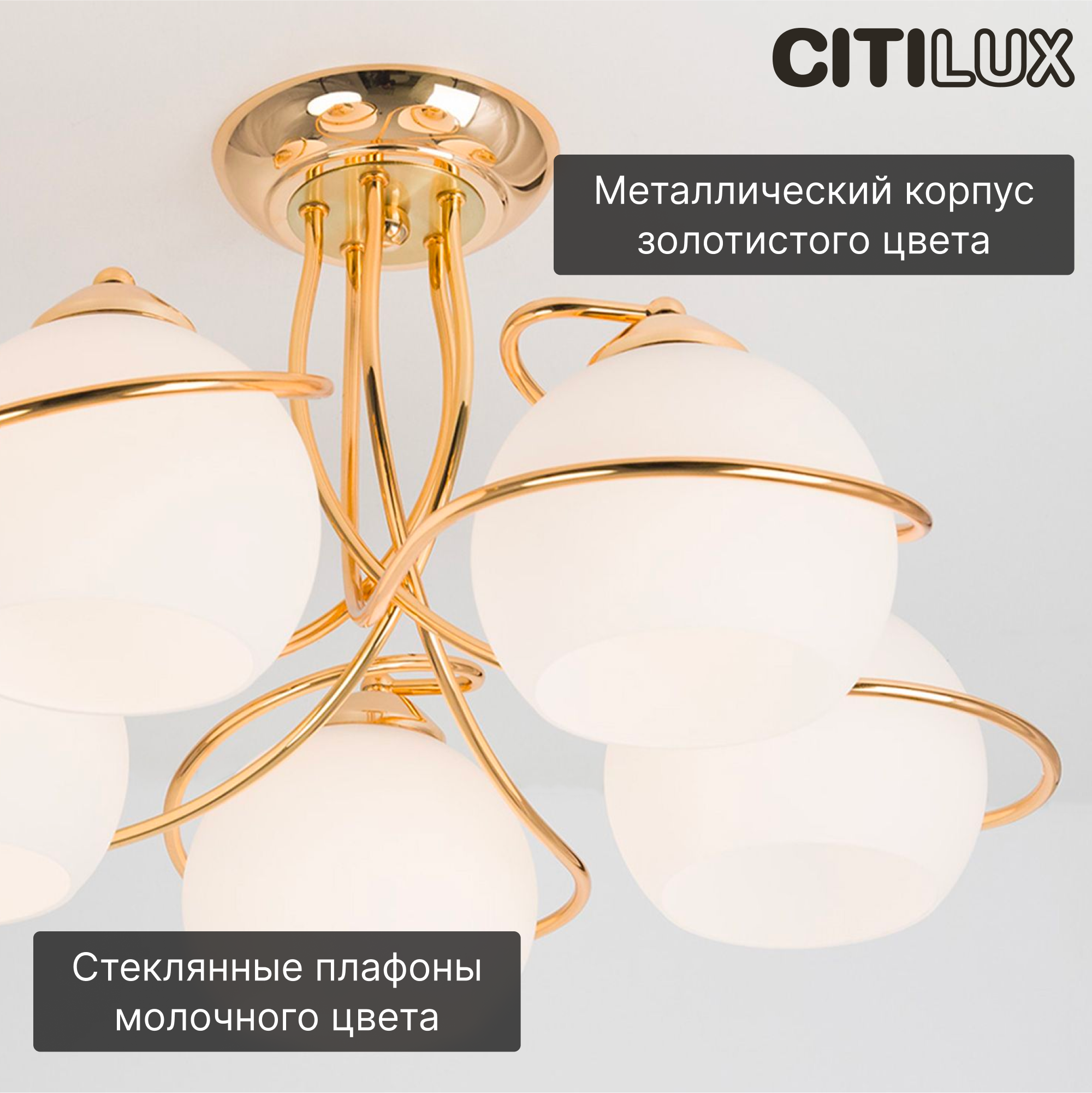 Потолочная люстра Citilux выполнена в стиле модерн и имеет достаточно необычный дизайн. Стеклянные молочно-белые плафоны «оплетаются» идущими от металлического основания «жгутиками», что создает эффект невесомости плафонов. Модель оснащена пятью лампами с цоколем Е27 мощностью до 100 Вт.