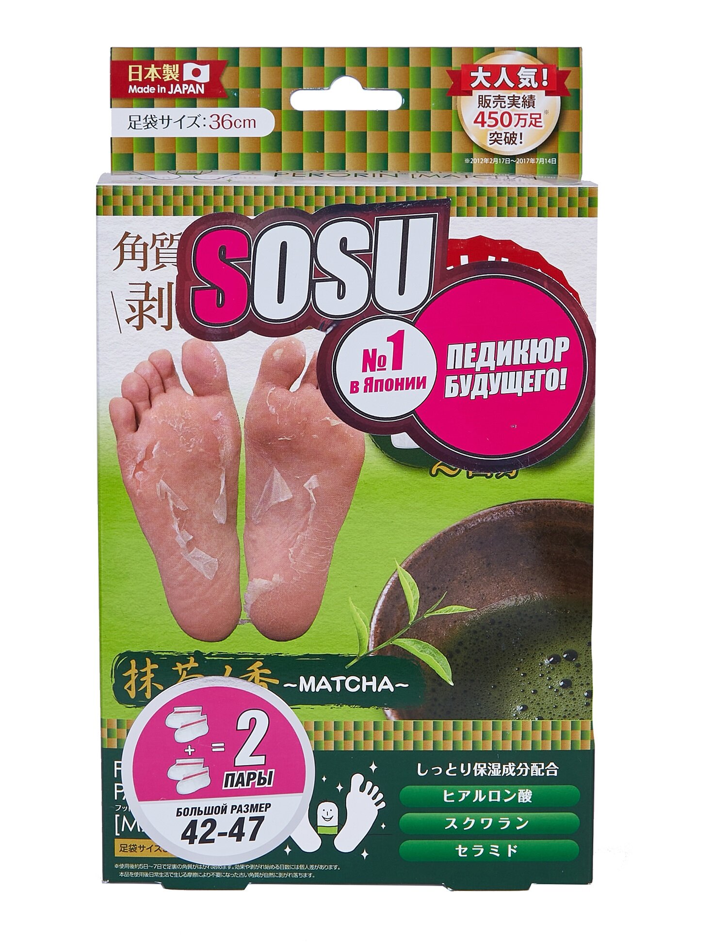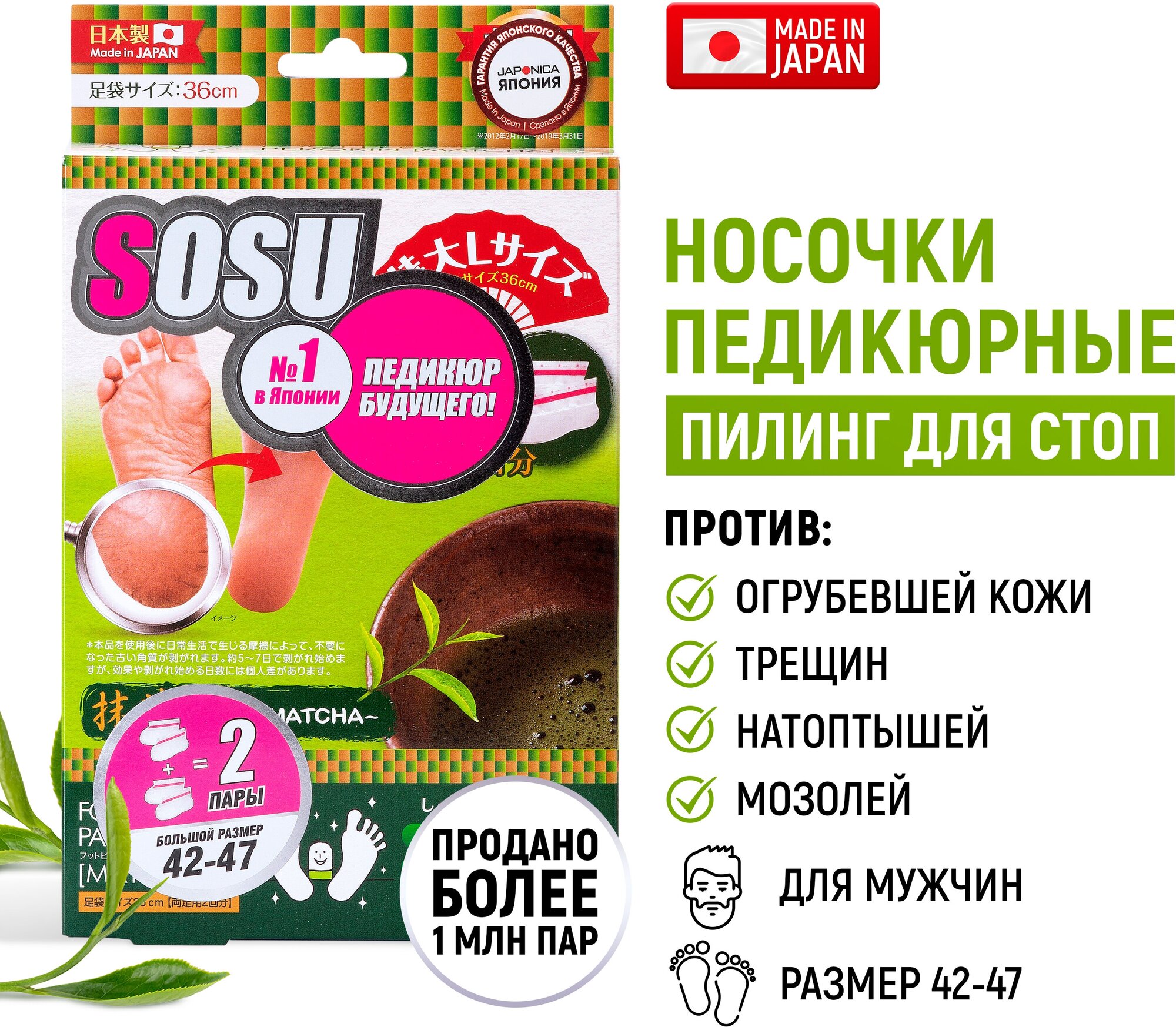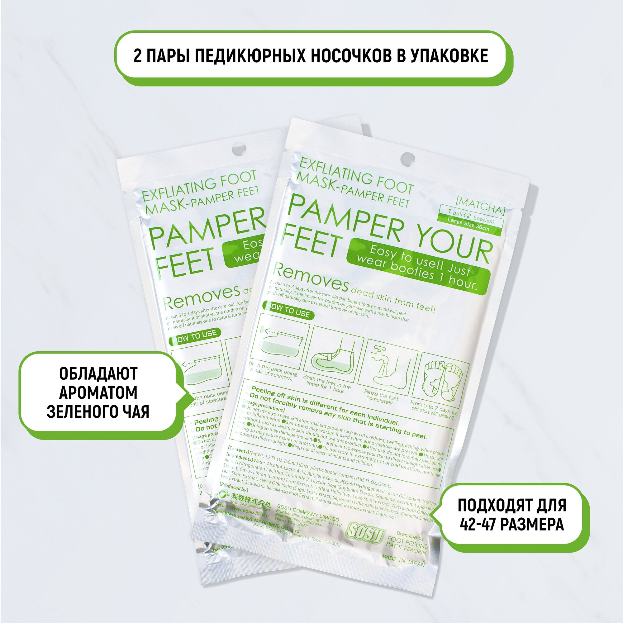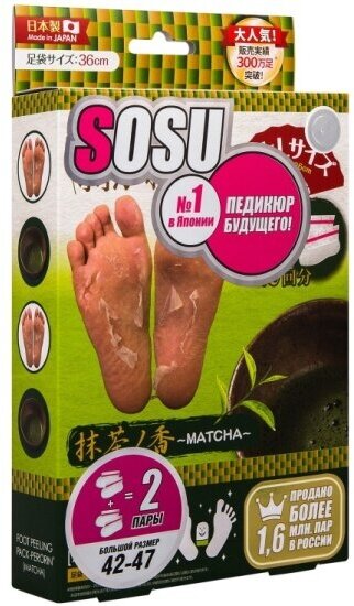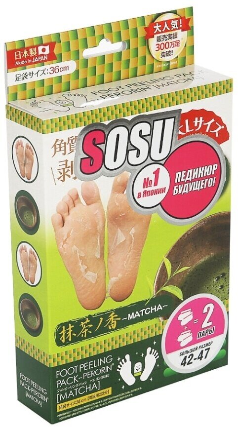 Носочки SOSU - это инновационный способ педикюра на дому без риска и траты времени на посещение дорогостоящих процедур. SOSU – новое слово в косметологии, разработанное японскими специалистами, которое уже по достоинству оценили женщины страны Восходящего Солнца, вверив самой природе заботу о своих ножках. Основной компонент активного вещества - молочная кислота и растительные экстракты лопуха, лимона, плюща, жерухи, шалфея, мыльнянки и др., стимулирующие естественный процесс отторжения мертвых тканей. Оказывают терапевтическое и эстетическое действие, быстро и безопасно решают косметологические проблемы стоп. Первый эффект заметен через 3-5 дней. Спустя две недели после применения кожа становится гладкой и упругой, сохраняя эффект в течение долгого времени. -Устранение трещин, потертостей и мозолей. Противогрибковый эффект. Противоотечное и противовоспалительное действие. Улучшение эстетических качеств кожи ступни. Обладают ароматом зеленого чая.