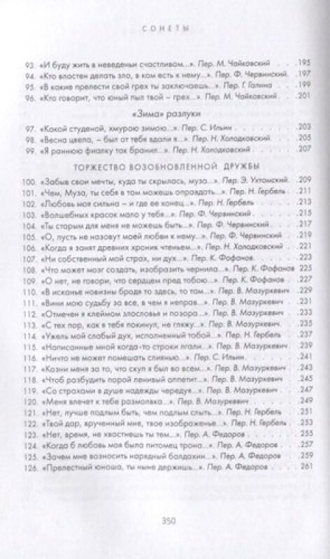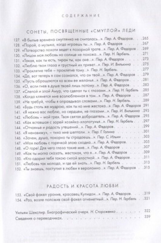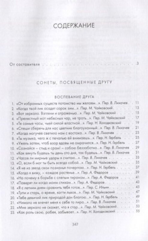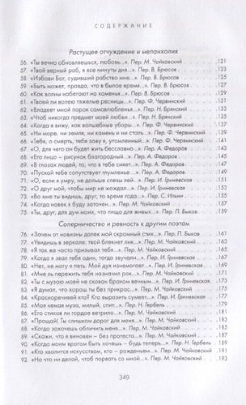 В этом издании сонеты Шекспира даны в переводах известных русских поэтов-переводчиков конца XIX - начала XX века: В. Брюсова, Н. Гербеля, Н. Холодковского, В. Лихачёва, В. Мазуркевича, А. Фёдорова, М. Чайковского и др. Большое разнообразие переводческих голосов и подходов порождает полифонию великих шекспировских текстов.
