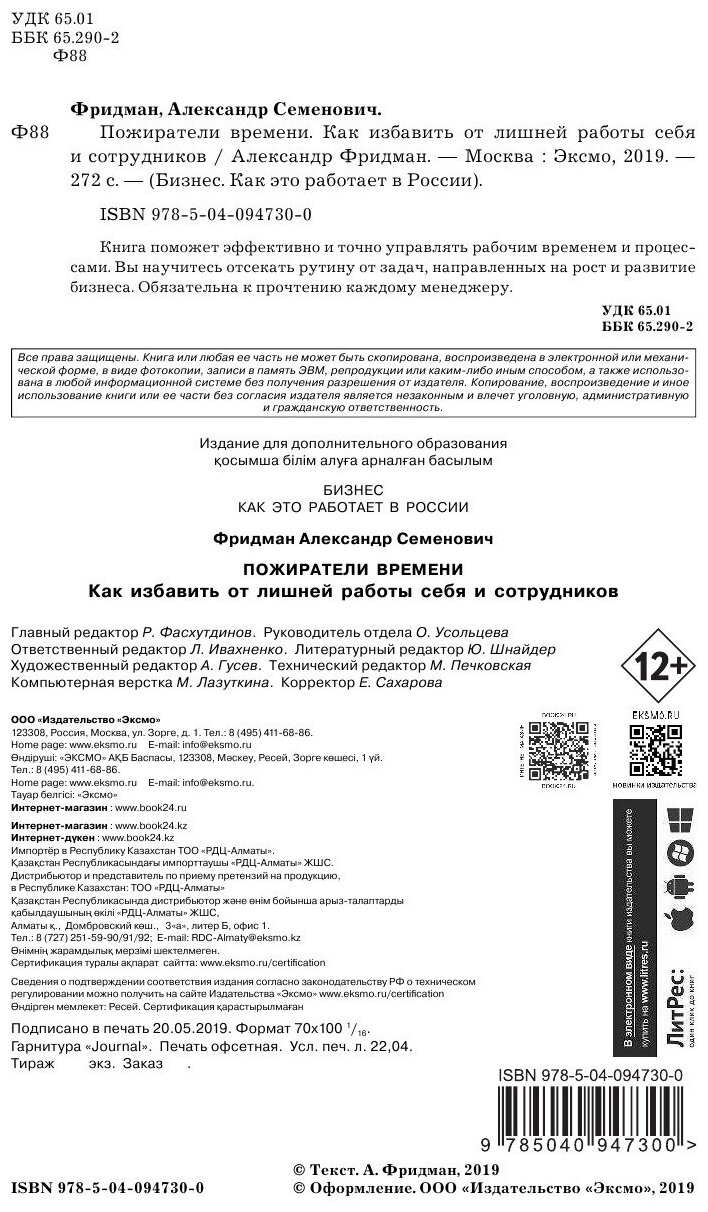 Пожиратели времени. Как избавить от лишней работы себя и сотрудников (Александр Фридман); Эксмо, 2019