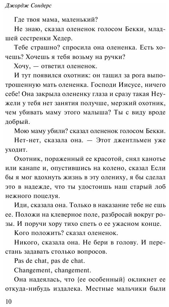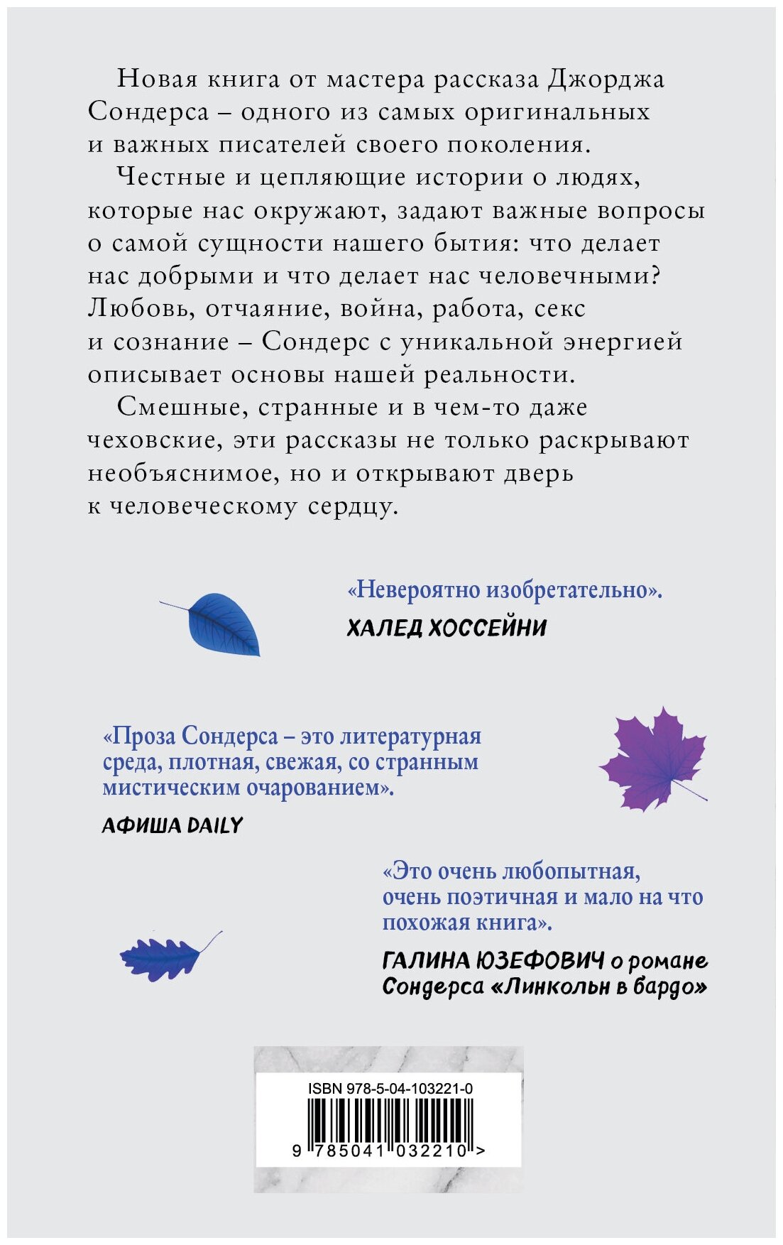 Честные и цепляющие истории о людях, которые нас окружают, задают важные вопросы о самой сущности нашего бытия - что делает нас добрыми и что делает нас человечными. Любовь, отчаяние, война, работа, секс и сознание - Сондерс с уникальной энергией описывает основы нашей реальности.