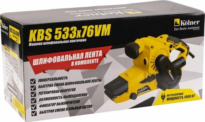 Ленточная шлифмашина Kolner оснащена встроенной системой сбора пыли. Большой пылесборник служит для поддержания чистоты на рабочем месте. Плавная регулировка скорости обеспечивает оптимальное качество обработки различных материалов. Удобная большая кнопка выключателя с фиксатором включения обеспечивает работу в непрерывном режиме. Шлифовальная лента просто заменяется при помощи специального рычага.