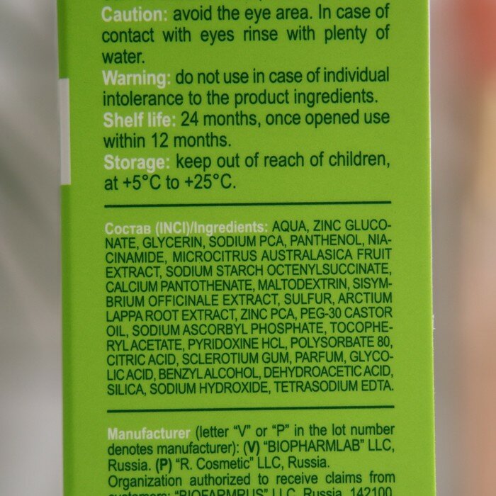 | Химический состав | aqua, sodium pca, microcitrus australasica fruit extract, polysorbate 80, sulphur, panthenol, sisymbrium officinale extract, arctium lappa root extract, citric acid, glycolic acid, zinc pca, sclerotium gum, niacinamide, calcium pantothenate, sodium ascorbyl phosphate, tocopheryl acetate, pyridoxine hcl, maltodextrin, sodium starch octenylsuccinate, silica, dehydroacetic acid, benzyl alcohol, glycerin, parfum, tetrasodium edta, sodium hydroxide. |