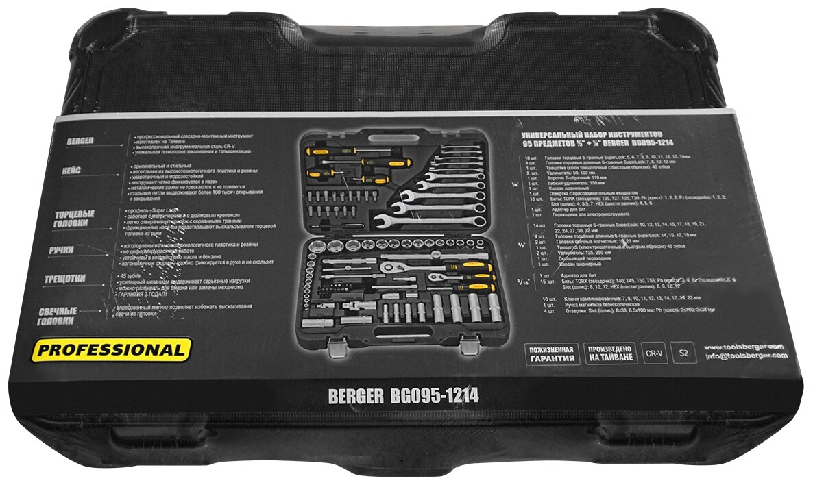 BERGER – универсальный набор инструментов для монтажных и ремонтных работ любой сложности. В наборе 95 предметов из качественной хромованадиевой стали. Резиновые рукоятки устойчивы к воздействию масла и бензина. Инструменты надежно фиксируются и не скользят в руке. Для удобства транспортировки набор поставляется в ударопрочном кейсе. Вес модели – 7,37 кг.