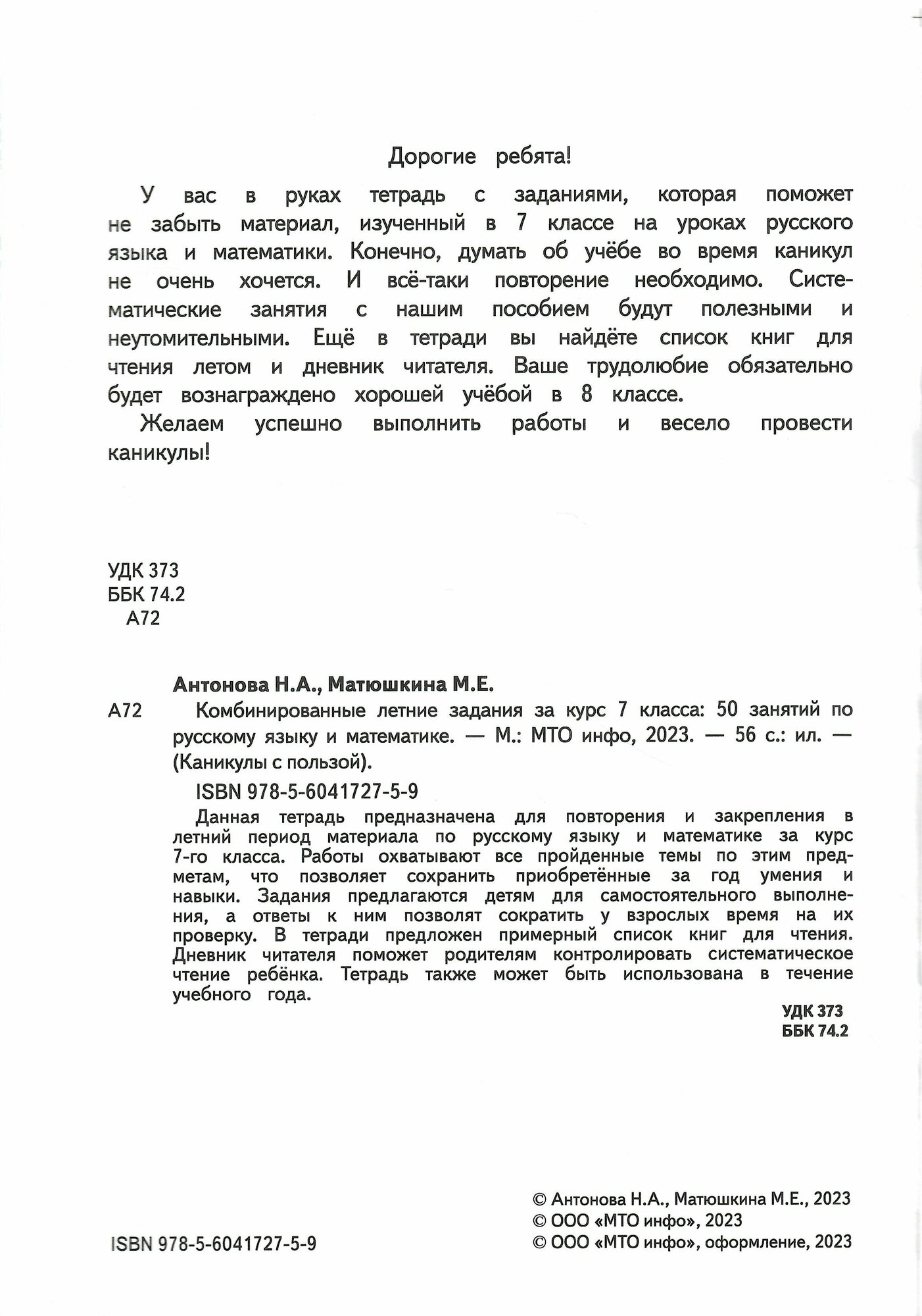 Комбинированные летние задания за курс 7 класс. 50 понятий по русскому языку и математике. (Антонова Наталия Андреевна, Матюшкина Мария Евгеньевна); МТО Инфо, 2022