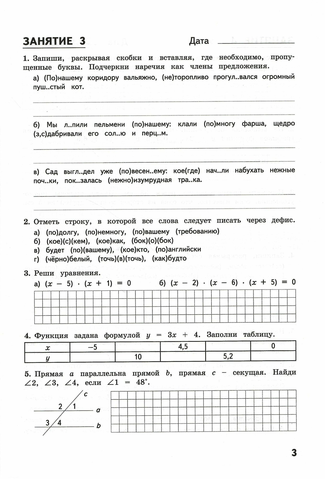 В тетради задания по русскому языку, алгебре и геометрии. Всего 50. Все задания выполняются в тетради, что удобно, можно брать с собой плюс ручка, карандаш и больше ничего не надо. В конце даны ответы для родителей, дневник читателя и небольшой список книг для чтения, правда, у нас только частично совпадает с тем, который дали в школе. На мой взгляд, для сильного ученика задания простые, подходят, чтобы не забыть за лето самое основное.