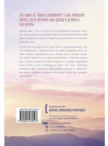 Книга не только сформирует у вас привычку писать, но и увеличит ваш доход и ценность как автора. Она не только для поклонников Хэла Элрода и его методики "Чудесное утро", она для всех творческих людей. Особенно для тех, кто работает с текстами.