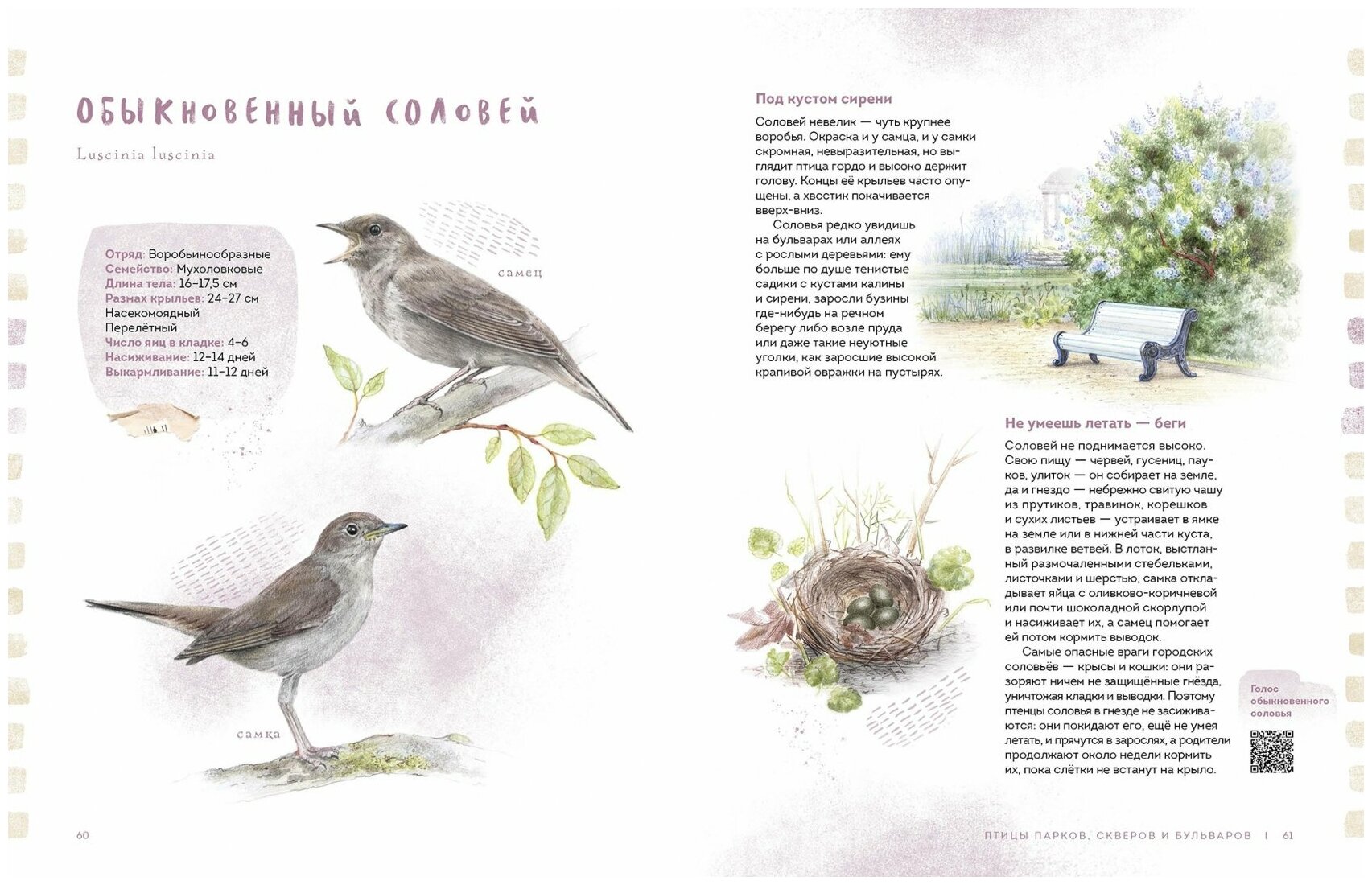 Признаюсь,что никогда не видела разницы между грачём,галкой и чёрной вороной,а уж разницу между полевым и домовым воробьями... а тут так просто всё описано.К тому же, скачав программу считывающую QR-коды, можно наслаждаться голосами птиц из книги.В конце книги есть несколько листов для записи и наклеек,где можно описать свою встречу с той или иной птицей.