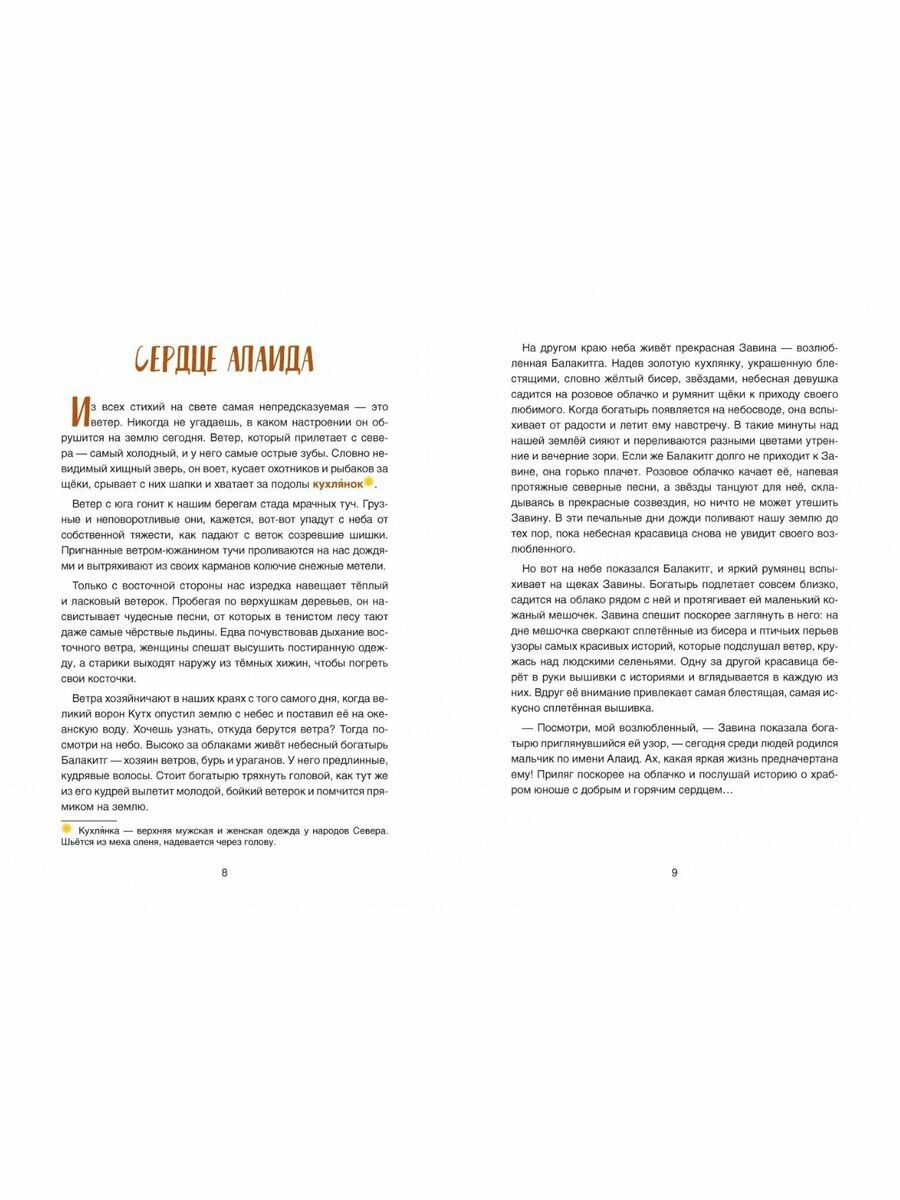 В этой книге две я бы сказала скорее легенды, а не сказки. Ну по крайней мере первая история - больше фольклор, эпос.Рассказ о богатыре, которому придется сражаться с духами, злыми божествами тех мест, где и родилась эта история. Помогают ему добрые духи, шаманы и пр. Алаиду надо спасти возлюбленную и помочь многим людям, которые пострадали от злого колдовства. По ходу развития сюжета ясно, как раньше объясняли природные явления, смену сезонов, появление каких-то животных и пр. Скажу сразу, конец... ну так себе. Это легенда, а не сказка, где все будет хорошо и герои поженятся. Тут Алаид спасет многих заколдованных людей, а сам... А его прекрасная Ияночх... Это повествование видимо для детей как минимум в начальной школе. Вторая история закончится повеселее :). Она тоже о происхождении мира по мнению ительменов. Кстати, читается очень современно, особенно оценят ее женщины :). Иллюстрации то на каждом развороте, то через разворот. Да, книга формата приблизительно А4, Бумага то ли гладкий белый офсет, то ли матовая меловка. Крупный шрифт..Сноски на каждой странице, если они есть. Буква "Ё" присутствует. Блок прошит. С возрастной аудиторией не определилась. Поставила от 7 до 10, но ближе к 10, чем к 7.