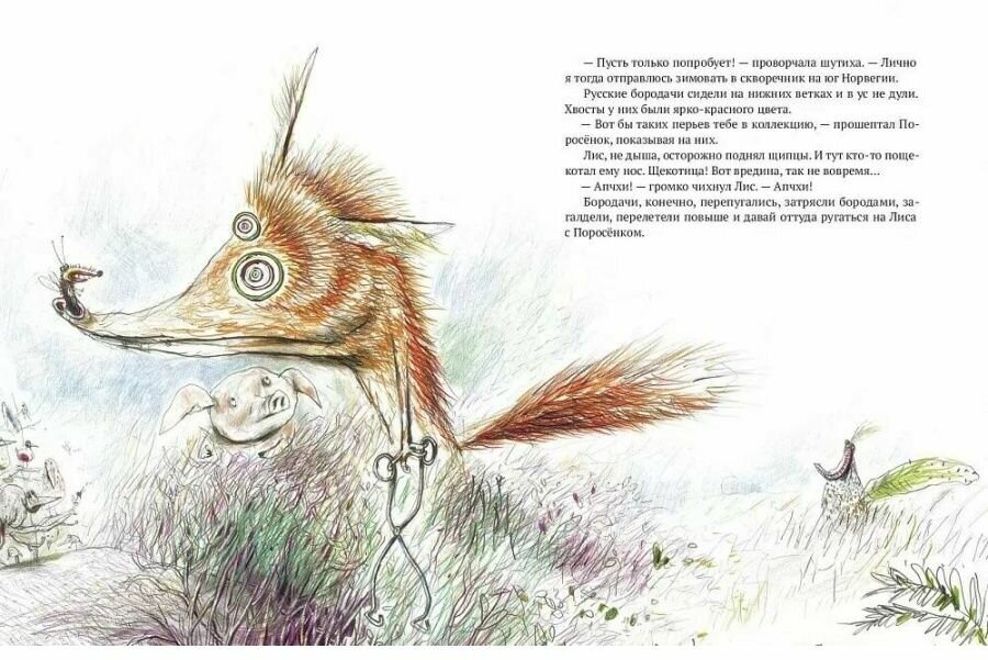 Но могу сказать, что вторая книжка – не менее веселая, чем первая. Вот только послушайте, каких птиц вы встретите на ее страницах: нежный пищик, русские бородачи, гуси-повторюси, кукушка-супушка, зяблик-спотыкач, шутиха, ну и, конечно, Очень Большая Проглотка! Ни в одном учебнике вы о них не прочитаете! А в кафе «Птичий хвост» они завсегдатаи!