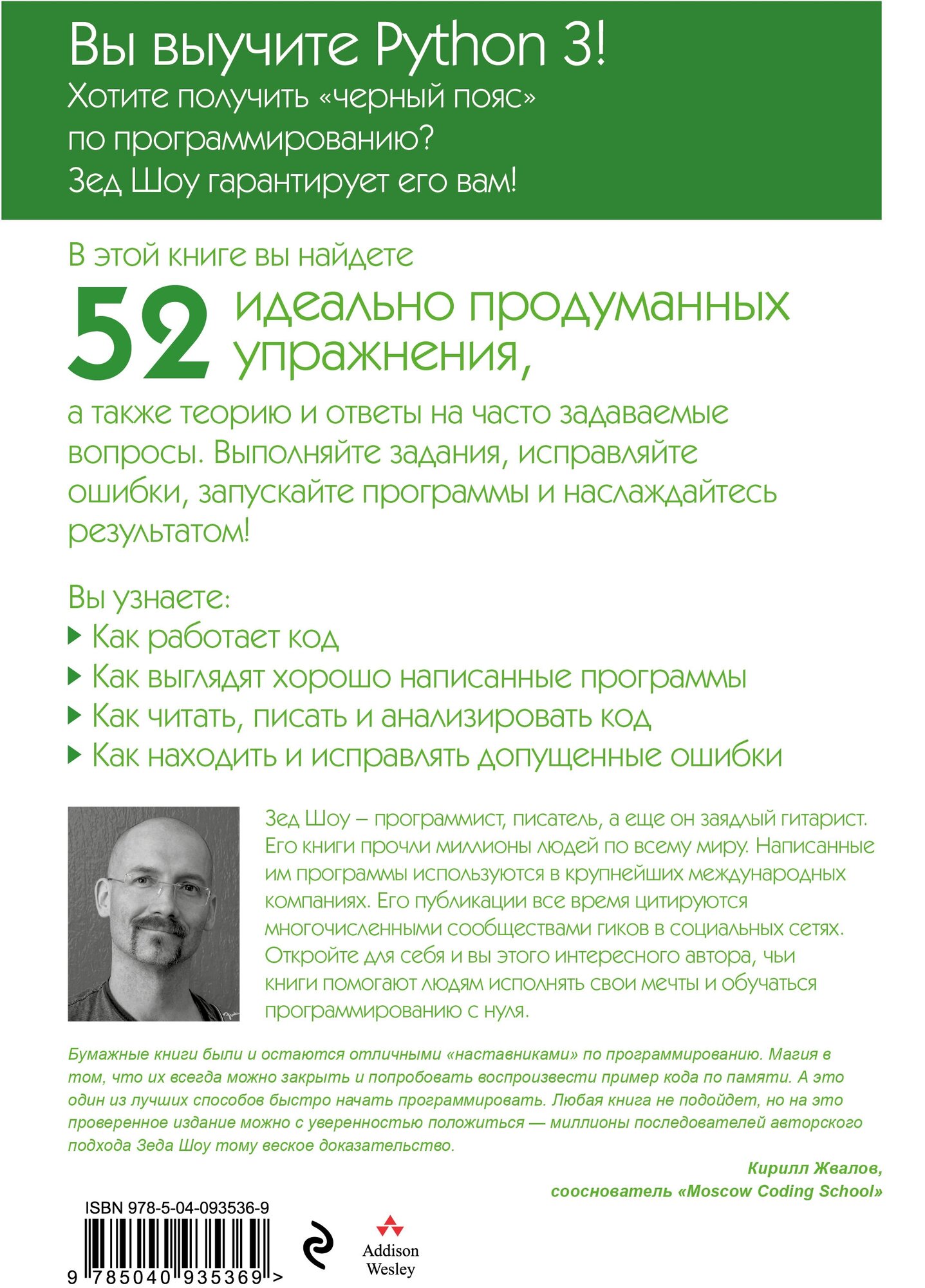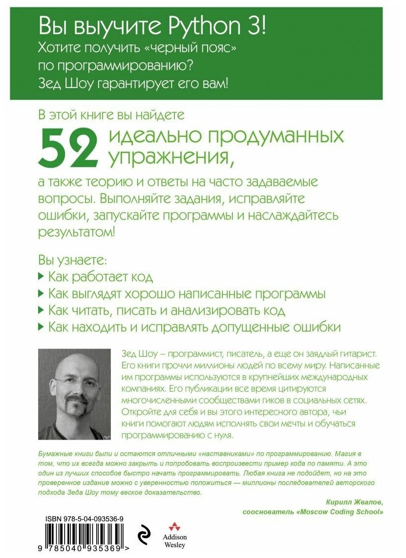 Зед Шоу - программист, писатель, а еще он заядлый гитарист. Его книги прочли миллионы людей по всему миру. Написанные им программы используются в крупнейших международных компаниях. Его публикации все время цитируются многочисленными сообществами гиков в социальных сетях. Откройте для себя и вы этого интересного автора, чьи книги помогают людям исполнять свои мечты и обучаться программированию с нуля.