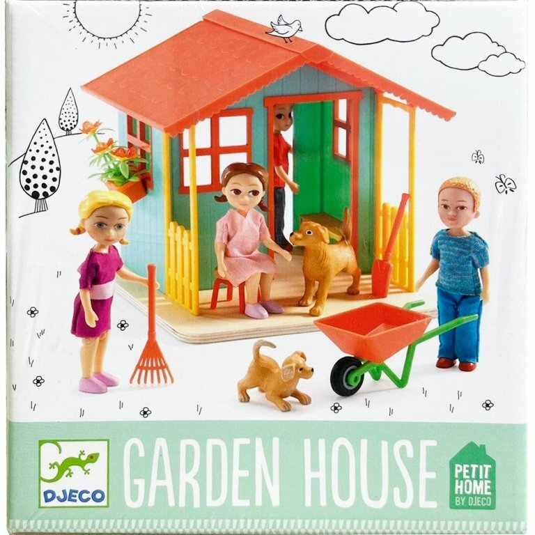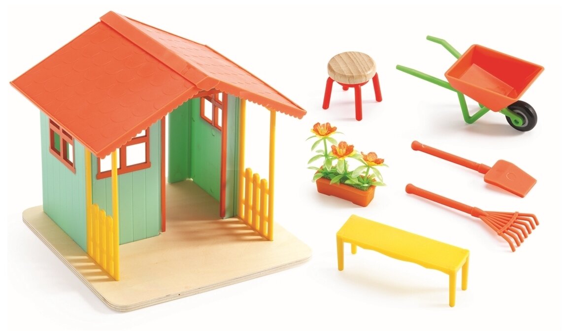 | Состав набора | Садовый домик; Скамейка; Стульчик; Лоток с цветами; Садовая тачка; Грабли; Лопата |