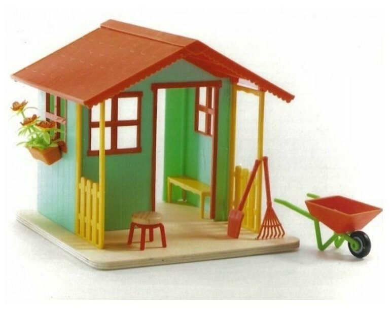 В садовом домике есть одна комната и симпатичное крылечко с цветочным лотком под навесом крыши. Домик можно дополнить мебелью для сада и создавать различные игровые ситуации.