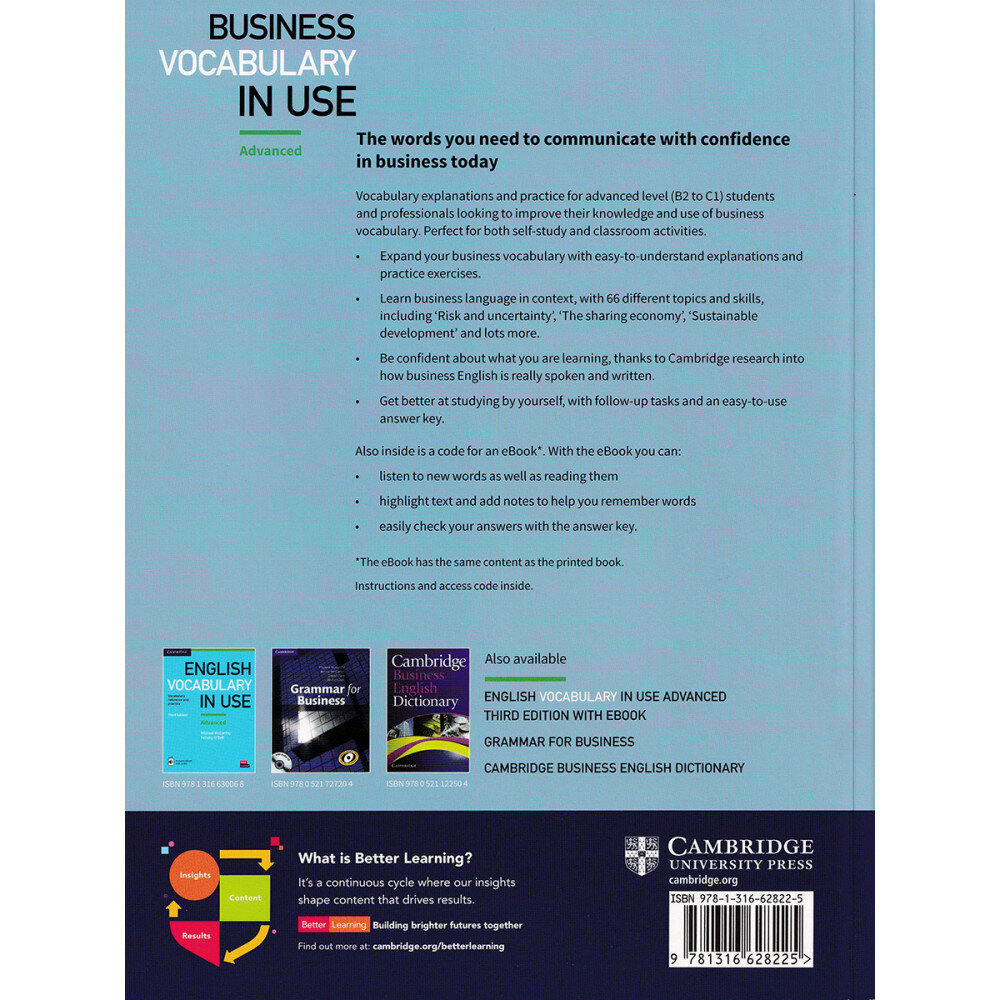 Vocabulary explanations and practice for advanced (B2 to C1) students and professionals looking to improve their knowledge and use of business English. This book is perfect for both self-study and classroom activities. Inside the book is a code for an ebook that can be used online with Macs, PCs and tablets. It can also be downloaded to iOS and Android tablets using the free Cambridge Bookshelf app. The ebook has the same content as the printed book, plus features such as audio so that you can listen to the words as well as reading them.