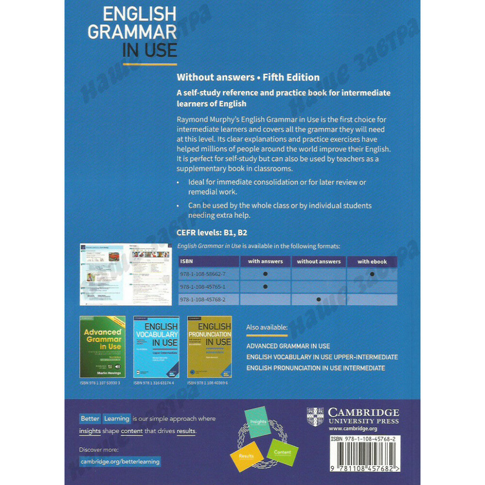 Raymond Murphy's English Grammar in Use is the first choice for intermediate (B1-B2) learners and covers all the grammar you will need at this level. This book without answers has clear explanations and practice exercises that have helped millions of people around the world improve their English. It is perfect for teachers to use in the classroom as a supplementary book, for extension work, or for homework activities.
