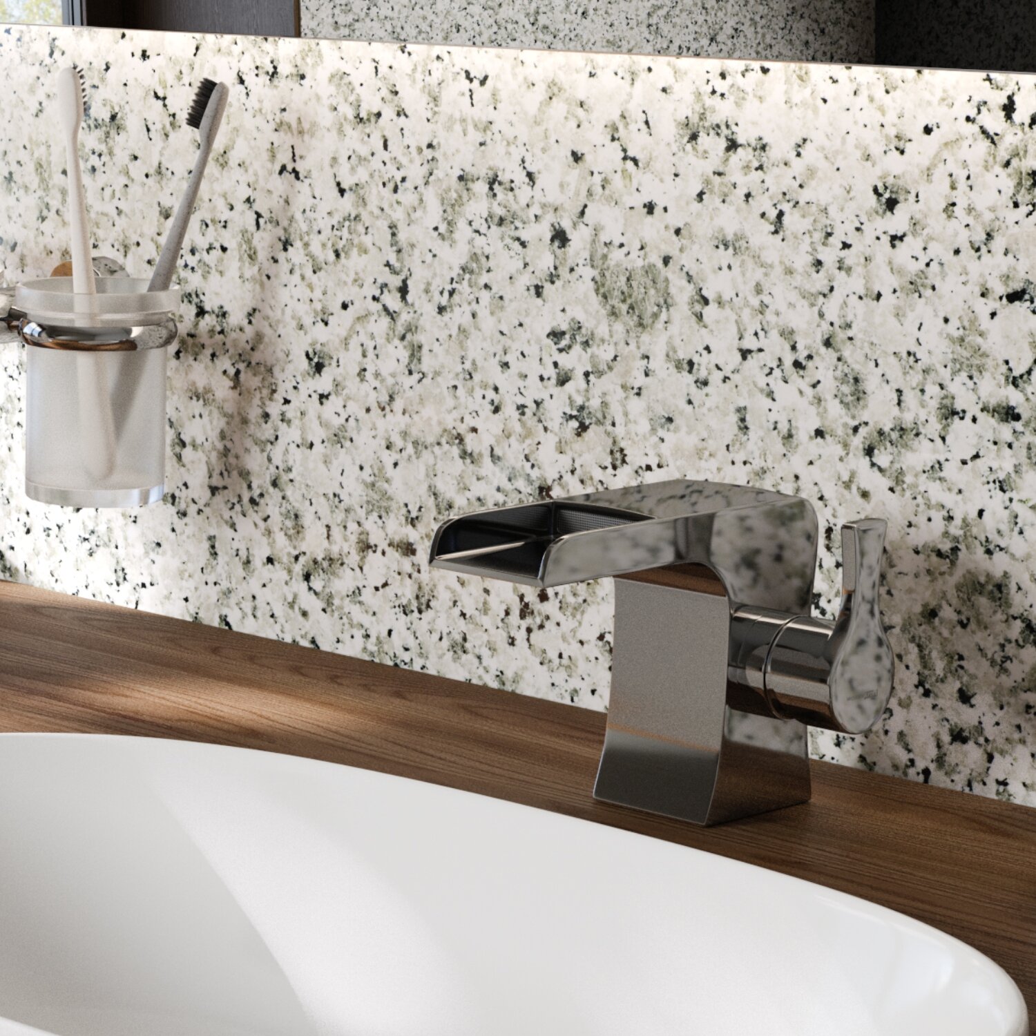 Хотелось в ванную комнату что-то необычного и эффектного. До этого с таким дизайном (каскадный смеситель) дело не имел. Очень стильно и эстетично вышло. Имейте в виду, что данная конструкция не подразумевает сильный напор, водичка аккуратно стекает. И это не недостаток - это особенность. Проблем никаких нет.