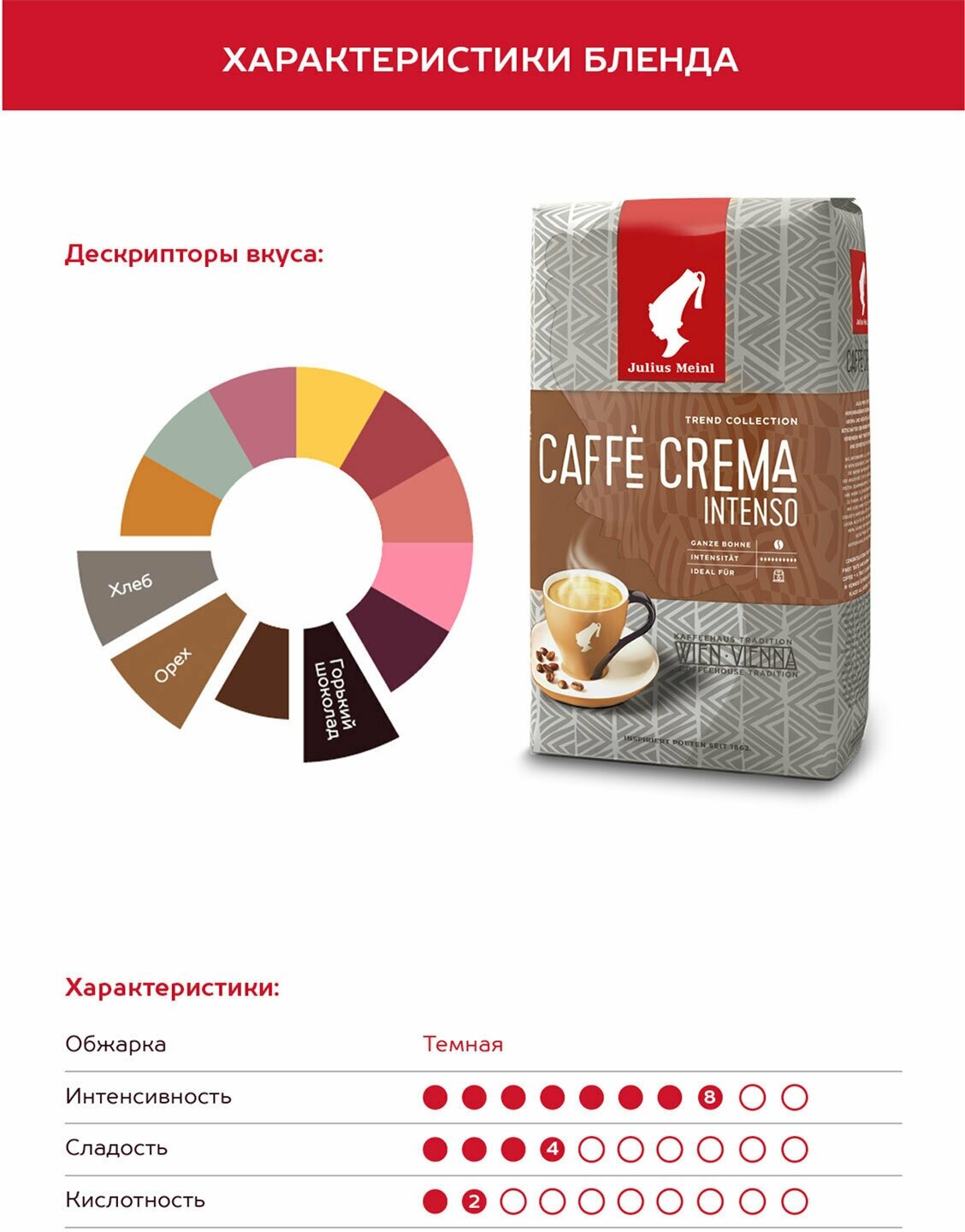 Кофе в зернах Caffe Crema Intenso Trend Collection – бленд, составленный из отборных зерен Южной Америки и Азии. Эта богатая смесь характеризуется полным и сильным ароматом, стойким послевкусием и очень сливочным пенкой крема. Идеально подходит для приготовления напитков с молоком.