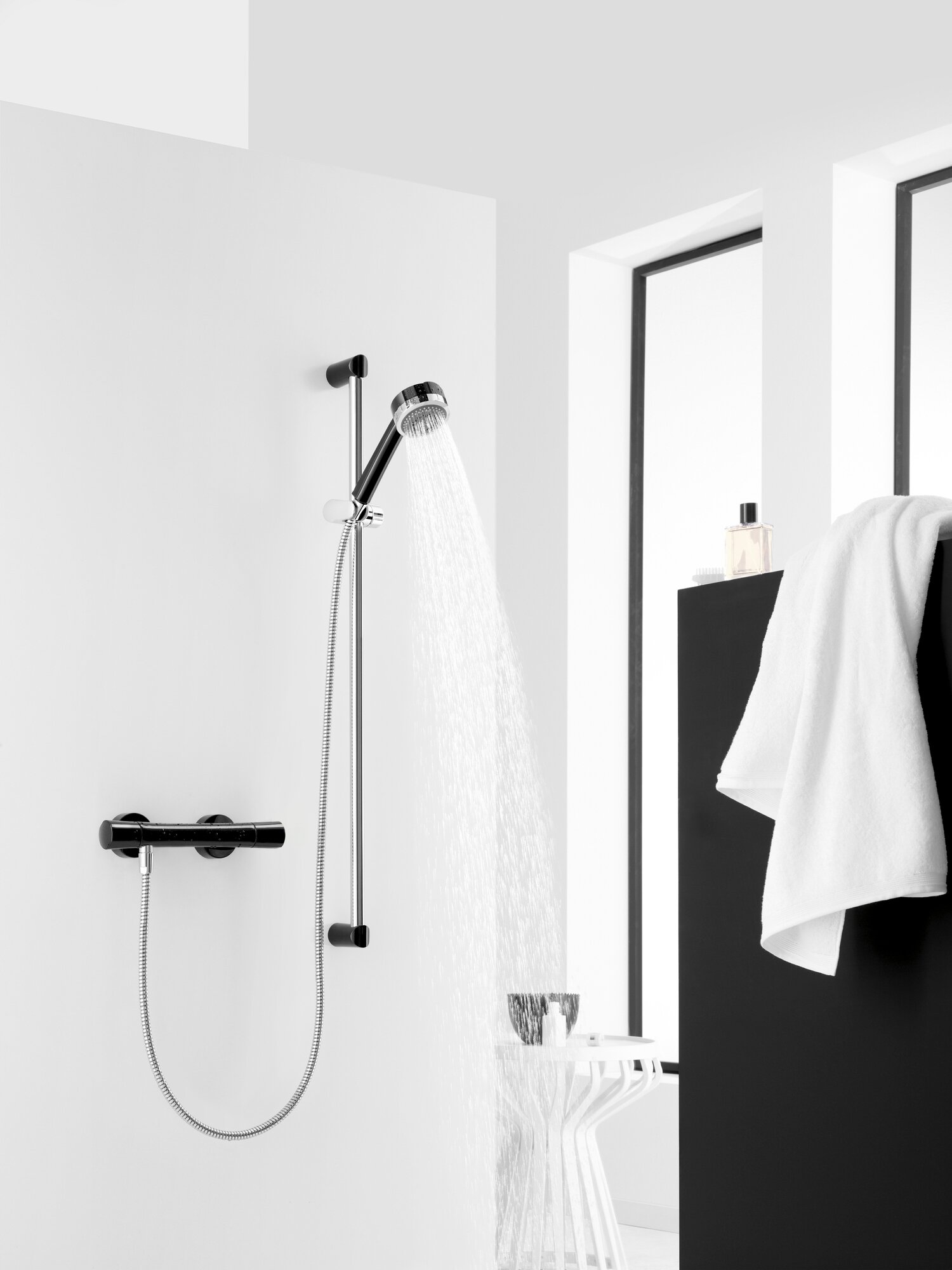 Термостатированный смеситель для душа, керамическая кран-букса с углом поворота 90°, рукоятка расхода с экономичной кнопкой и индивидуально устанавливаемым стопором, стопор безопасности на 38°C, расход воды 18 л/мин.