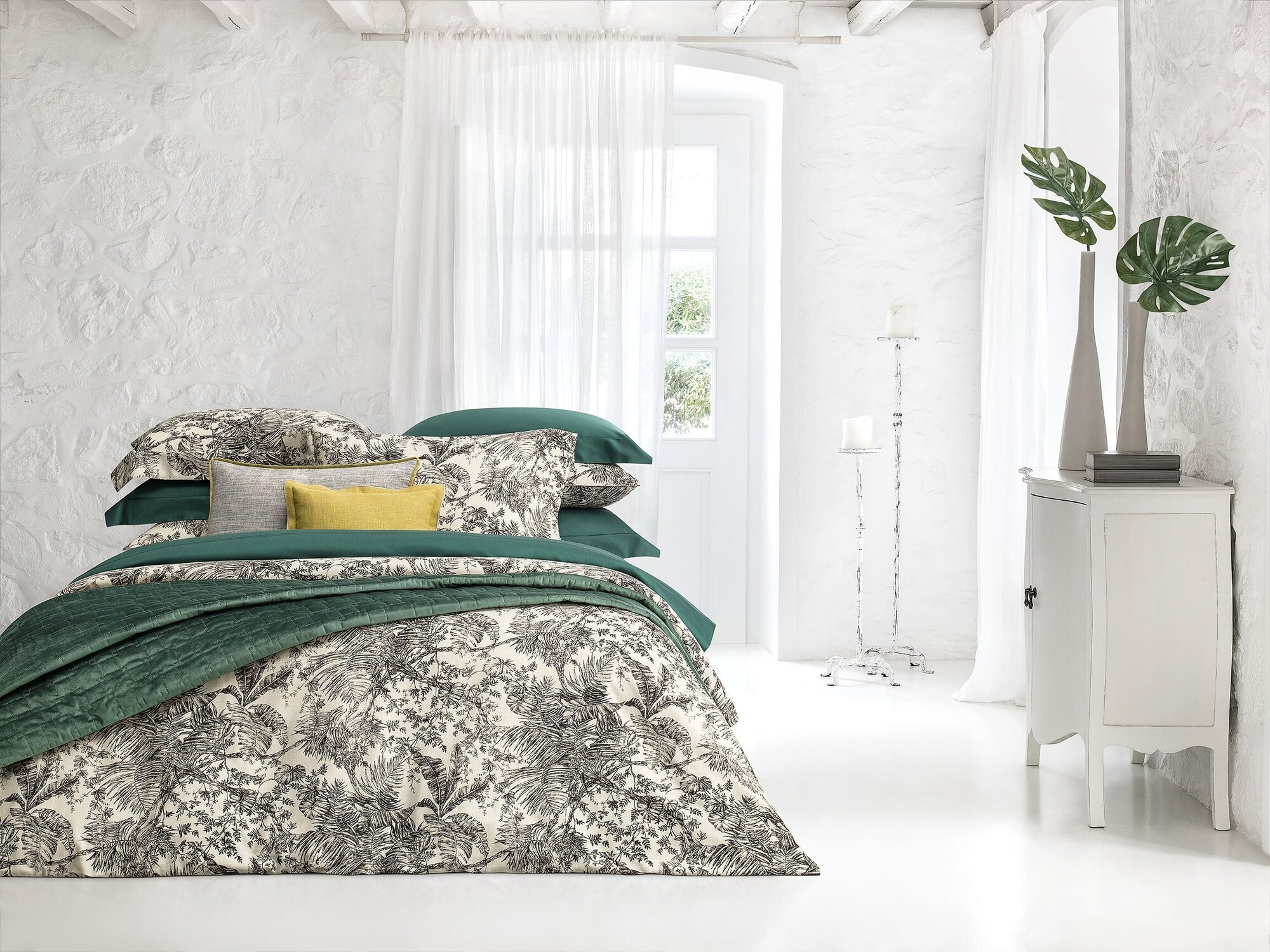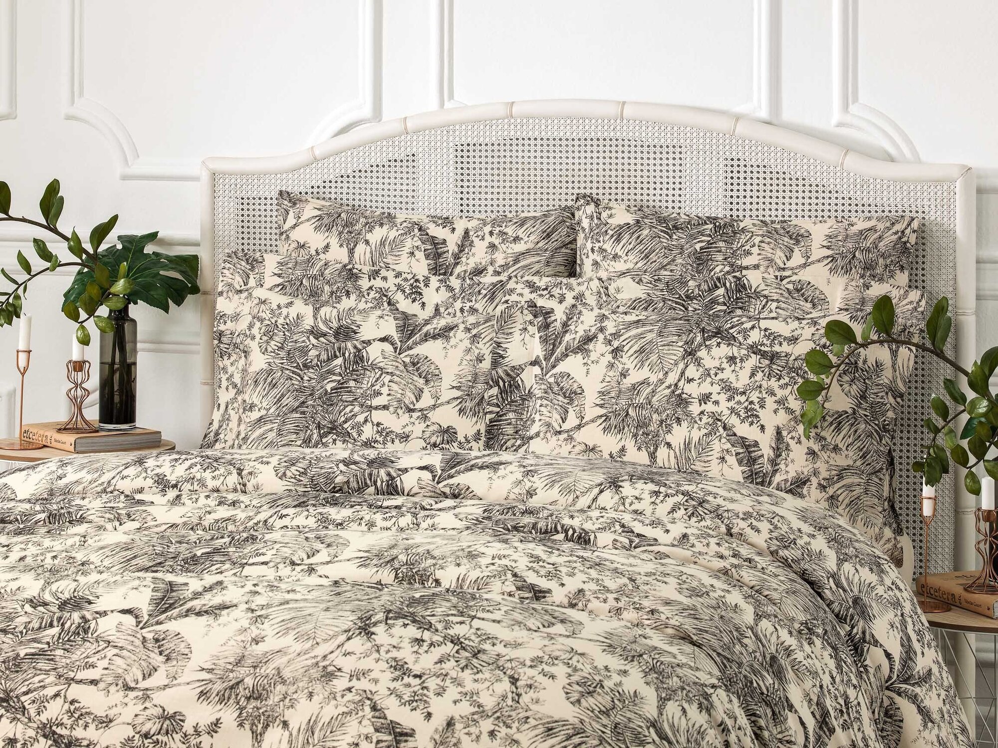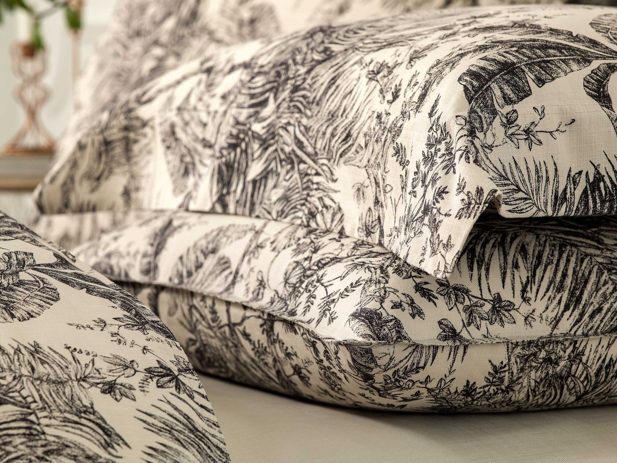 Наволочки «Доминика» изготовлены из плотного 100% хлопка высокого качества, напоминающего лен, однако в отличие от льняных тканей, которые сильно сминаются, белье практически не мнется. Этот материал, несмотря на выраженную фактурность, очень мягкий и приятный на ощупь, при этом «Доминика» не уступает льняной ткани в прочности и долговечности. В комплекте использованы только два цвета: естественный бежевый – природный оттенок льна в качестве фона, а также темно-шоколадный – цвет орнамента. Рисунок «Доминики» – растительность тропического леса: крупные листья пальм и лиан, пышные заросли папоротников. Тропический стиль – один из основных трендов в текстильном дизайне на протяжении нескольких последних лет.