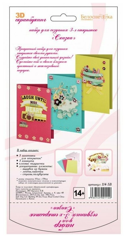 | Комплектация | заготовки - 3 шт, конверты - 3 шт, комплект клеевых подушечек 7х7 см - 1 шт, декоративные элементы |
