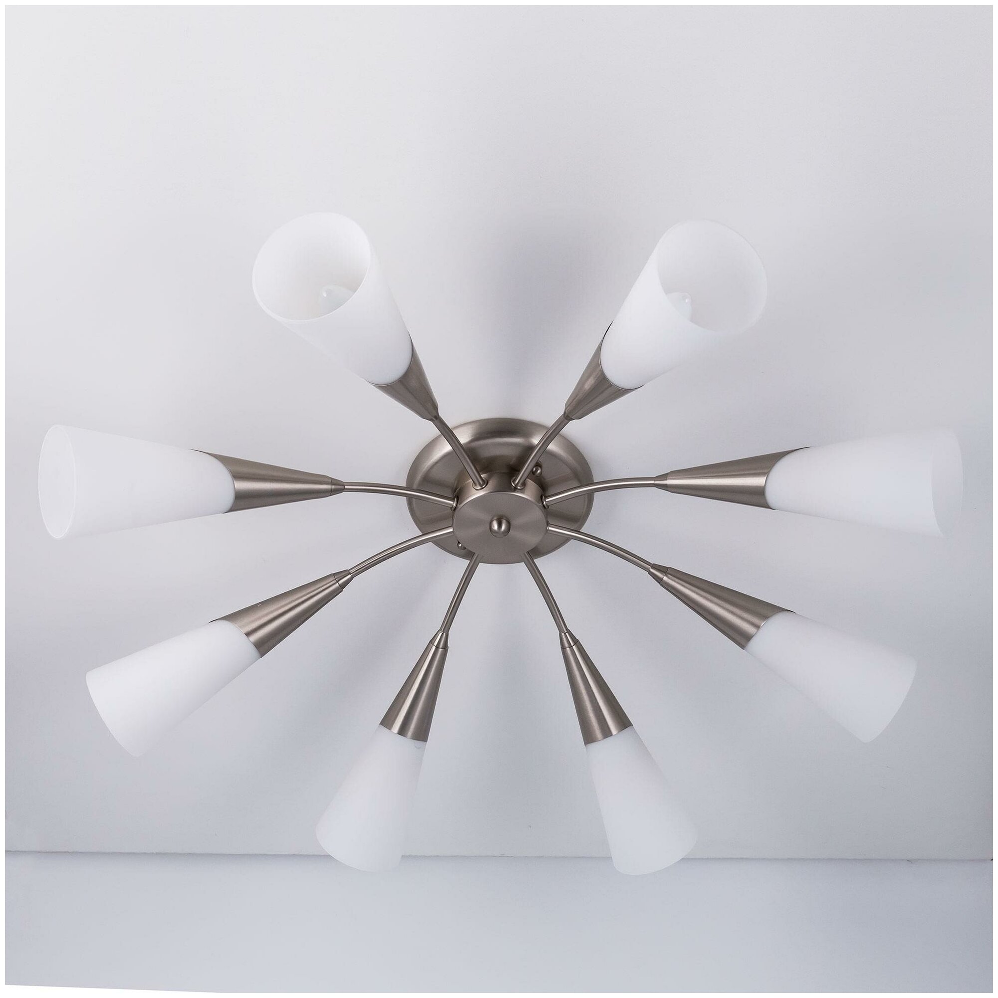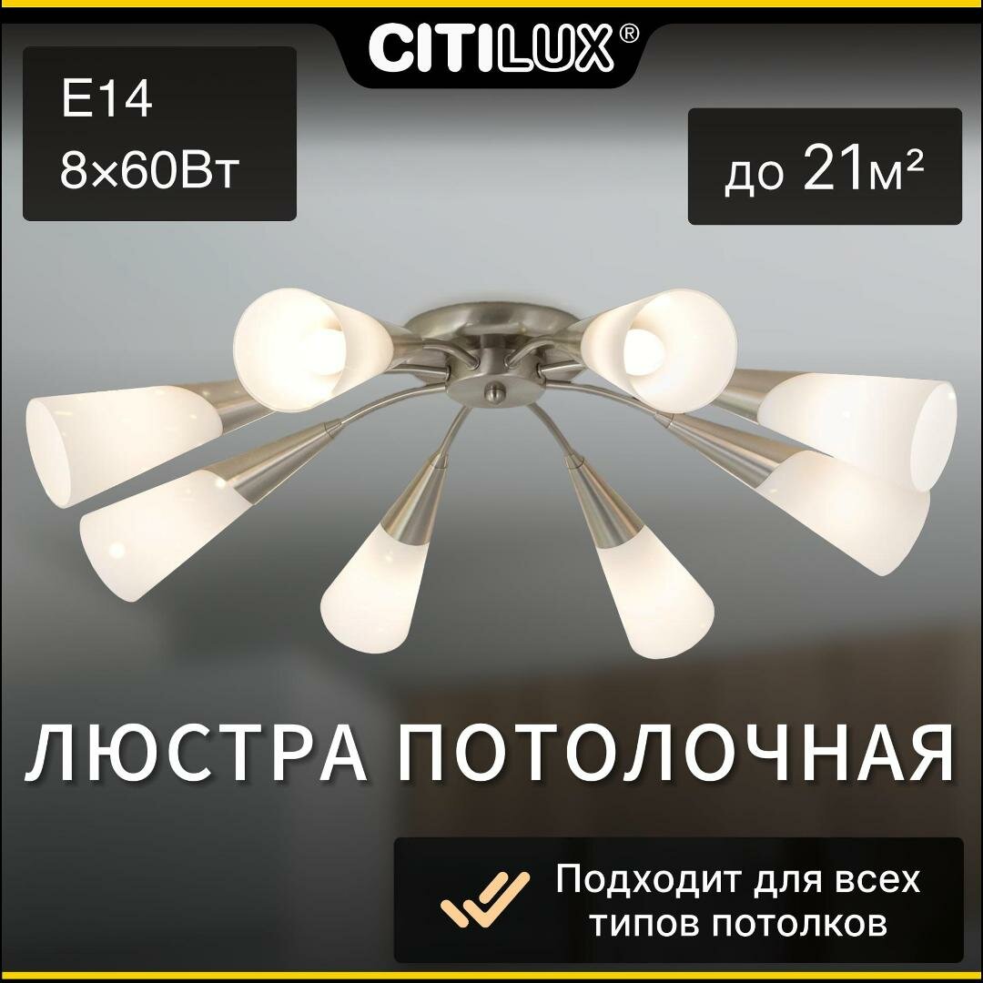 Люстра Citilux изготовлена в стиле модерн. Она станет элегантным элементом современного интерьера. Прибор использует шесть ламп максимальной мощностью 60 Вт каждая. Благодаря тому, что основание люстры сделано из металла, она прослужит долго. Плафоны выполнены из стекла. Вес люстры - 3,5 кг.