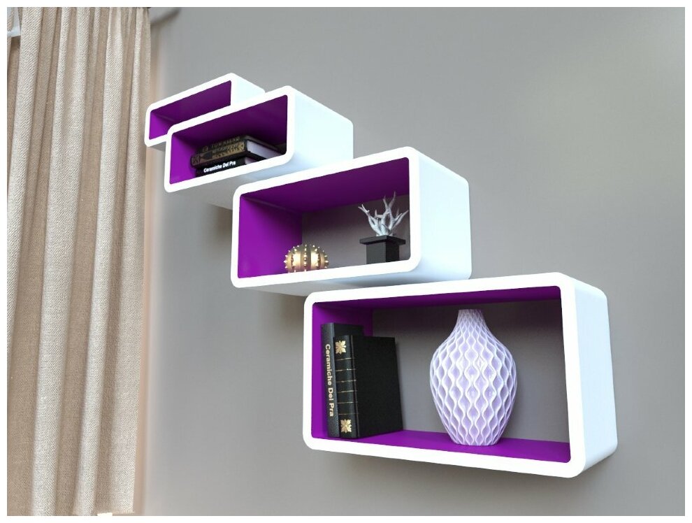 Комплект полок QWERTY поможет воплотить дизайнерские идеи. В сочетании с контрастными оттенками привнесет новинки в интерьер вашего дома. Полки от QWERTY помогут превратить пустую стену в превосходное место для хранения и демонстрации красивых вещей. Отлично подойдут для размещения любимых книг, памятных фотографий, интерьерных украшений и комнатных растений.Способ применения: Сделать разметку на вертикальной стене. Просверлить отверстия. Вставить дюбеля в отверстия, закрутить саморезы в дюбеля, оставив 5 мм. Повесить полку.Материал: МДФ, покрытое полиуретановой краскойУсловия хранения: Хранить вдали от нагревательных приборов.Рекомендации по уходу: только для использования внутри помещений. Рекомендовано для гостиной, спальни, кухни, прихожей, кабинета. не рекомендовано использовать в ванной комнате. Не допускается использование абразивных порошков. Чистящее средство не должно содержать окисляющих компонентов, сильных щелочей. Пыль удаляется чистой сухой мягкой тканью.Комплектность: 4 полки, саморезы и дюбеля.Температурный режим: от +10С до +50С.размер - 47х27х20 см; 43х23х20 см; 38х18х20 см; 34х14х20 см, толщина 1,8 см. 47х27х20 до 5 кг в подвешенном состоянии, до 13 кг при расположении на полу; 43х21х20 до 4 кг в подвешенном состоянии, до 12 кг при расположении на полу; 39х16х20 до 3 кг в подвешенном состоянии, до 11 кг при расположении на полу; 35х12х20 до 1,5 кг в подвешенном состоянии, до 10 кг при расположении на полу.