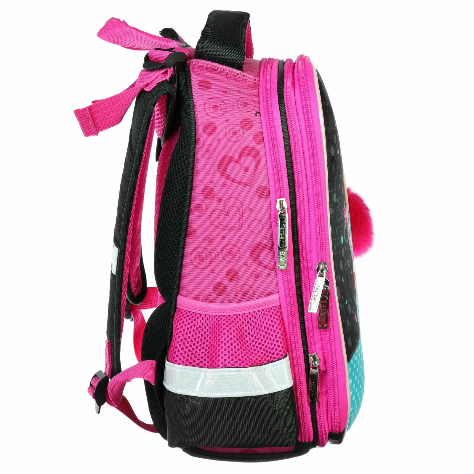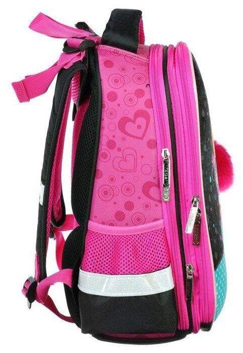 Выполнен из современного пористого EVA материала с покрытием из водонепроницаемого высококачественного полиэстера. Ткань устойчива к выгоранию, не имеет запаха. Для удобства в эксплуатации имеется ручка для переноски с пластиковой накладкой и петля для подвешивания рюкзака на крючок. Светоотражающие элементы обеспечивают безопасность ребенка в темное время суток. Содержимое такого ранца всегда будет в полном порядке благодаря надежному жесткому корпусу. Анатомическая вентилируемая спинка, лямки, регулируемые по высоте в зависимости от роста ребенка, обеспечивают плотную фиксацию ранца, предотвращая перенапряжение мышц спины. Ранец имеет 2 независимых отделения на молнии – основное (с двойной перегородкой) и дополнительное, содержащее органайзер, отделения для хранения мобильного телефона и ручек, карабин для ключей и карман для прочих аксессуаров.Дно ранца выполнено из водонепроницаемого ПВХ и дополнительно оснащено пластиковыми ножками для защиты от загрязнений и влаги.