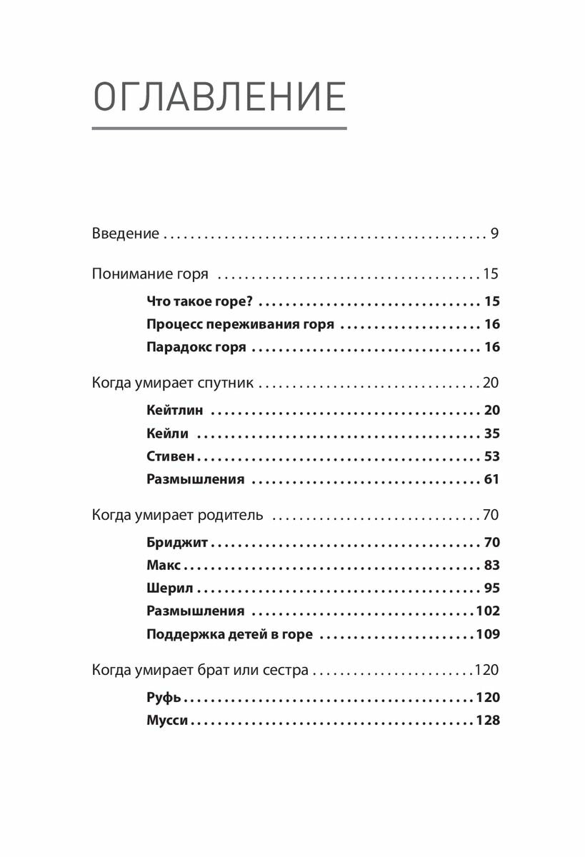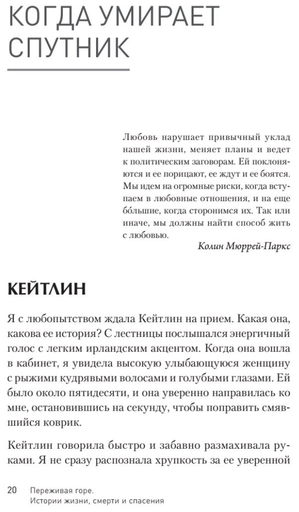 Я считаю, что книга бесполезна. Вот честно. В книге несколько блоков – потеря партнёра, потеря родителя, потеря ребенка, потеря брата, сестры… К каждому блоку автор приводит пример нескольких пациентов из собственной практики. И в половине случаев я не вижу, чтобы автор помогла своим пациентам. Вдовец внезапно перестал ходить на сеансы – выяснилось нашел новую пару. Не терапия ему помогла. Больше всего запомнился случай когда у женщины от болезни умирала сестра, долго, пять лет. И все пять она мучалась чувством вины. Пять лет, ежедневные сеансы, а результат под большим вопросом.